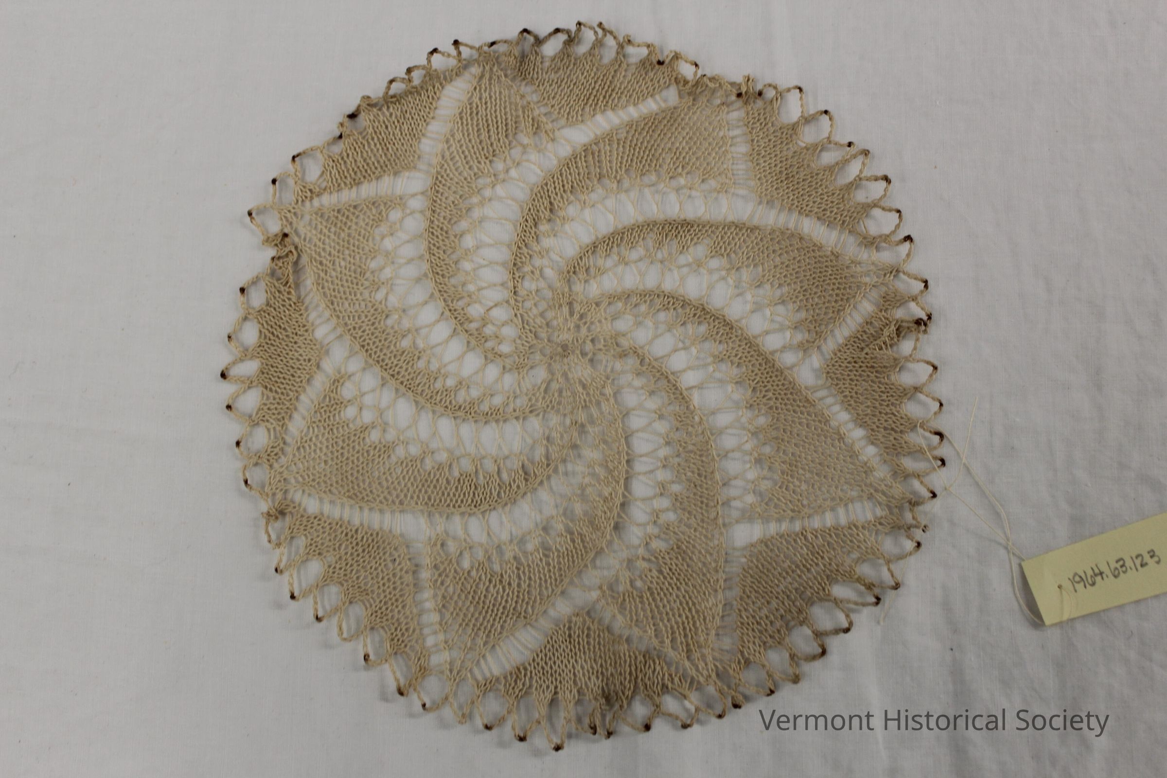 Knitted linen doily in a spiral flower design.