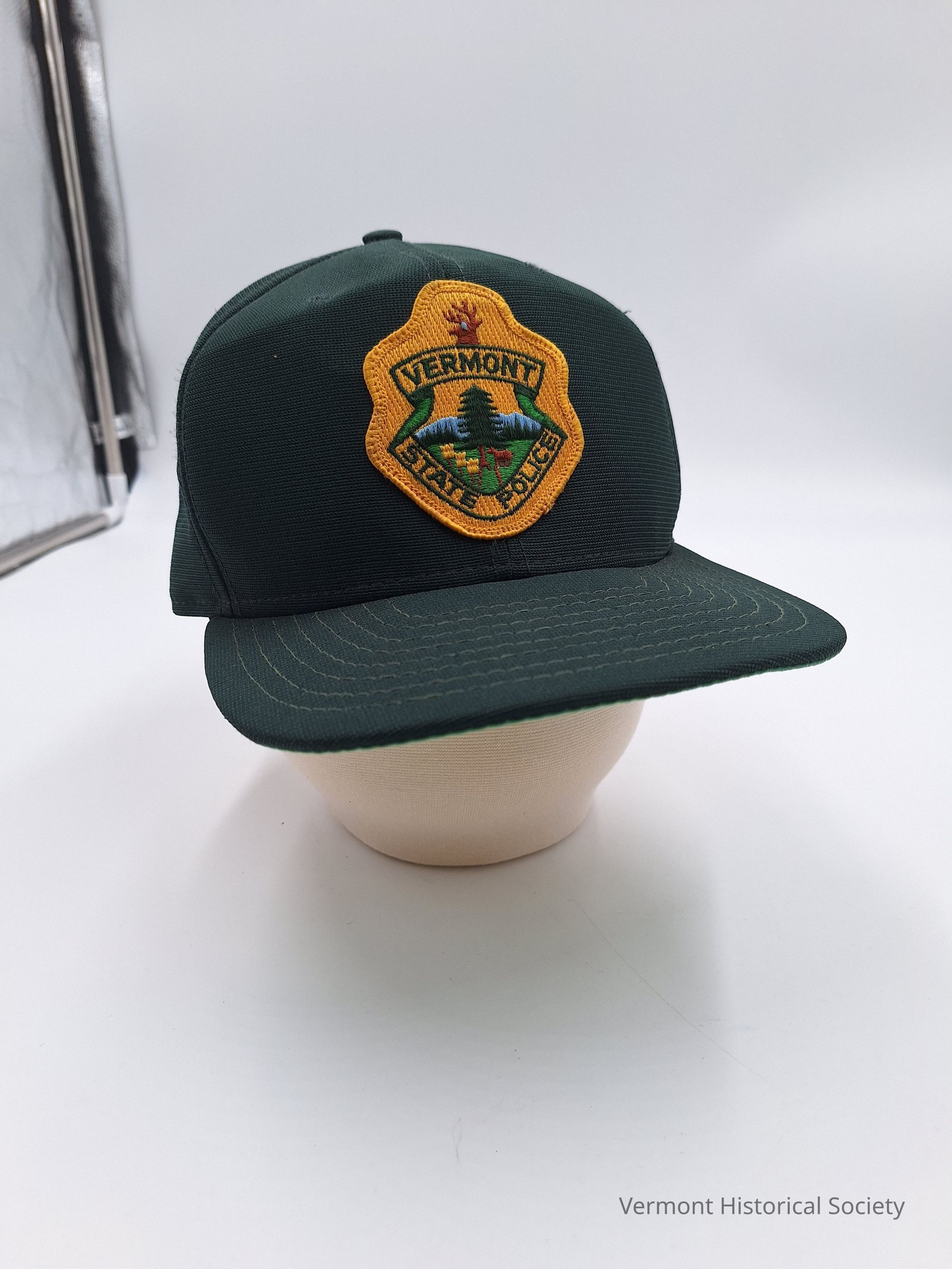 Dark green baseball hat with the yellow insignia patch on the front for the Vermont Auxiliary State Police. The hat is made of a textured green breathable cotton/polyester and the brim has eight rows of concentric stitching. The patch on the front of the hat is shield-shaped with notched upper corners and a yellow ground. Embroidered on the patch is a stag at the top over the banner reading "VERMONT STATE POLICE" around an image of a large fir tree in front of mountains with a deer at the base of the tree. The hat has an arched opening at the back with a plastic snap band to adjust the size of the hat to the wearer's head.Context
