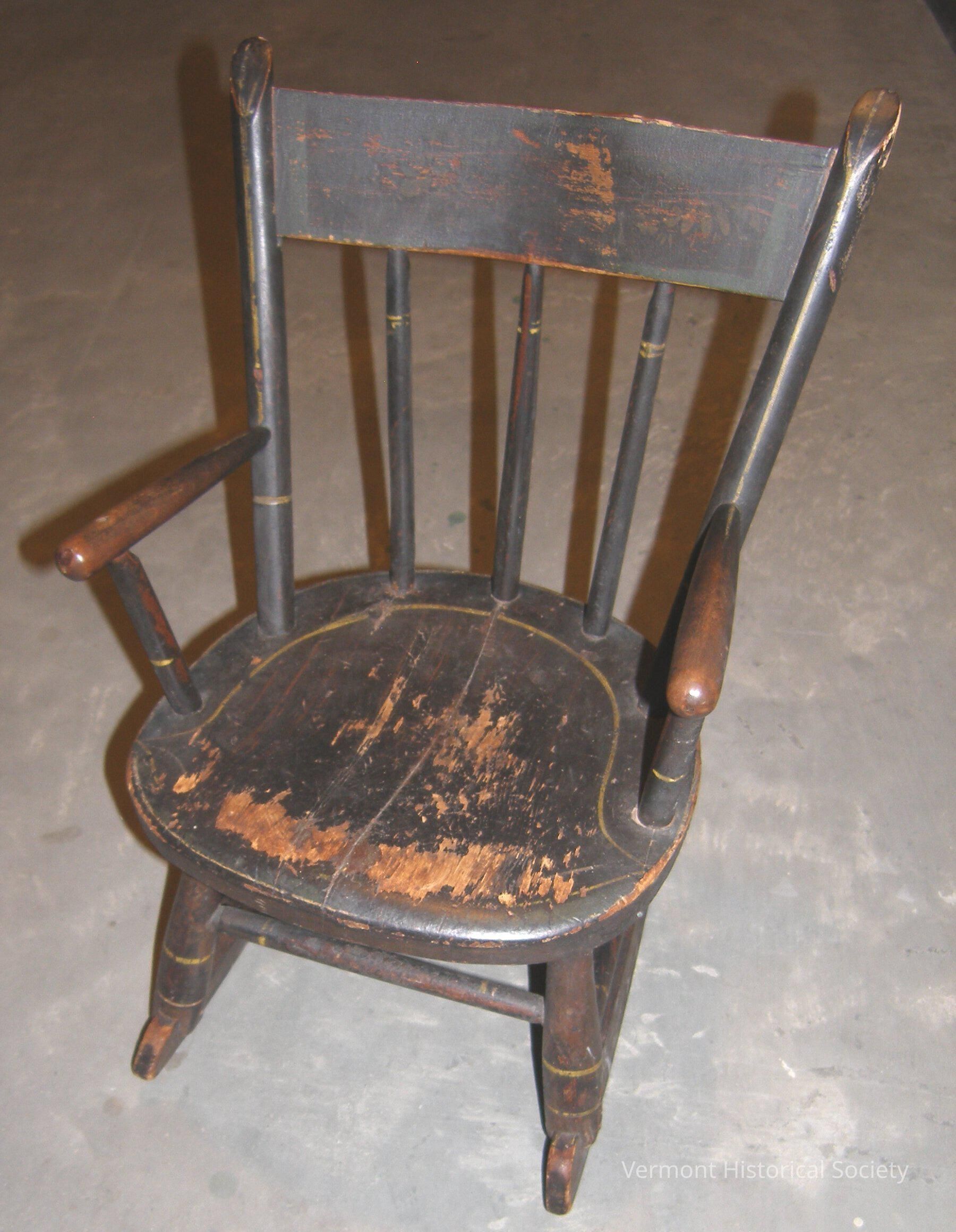 Rocking chair sized for a child. The back has 3 spindles and a curved rail. The arms are turned and held up by a short spindle. The chair is painted black with decorative yellow pinstriping on the spindles, seat, and legs. The label, "Ella Louisa Knapp's chair Christening May 10, 1858 Born August 3, 1857 Died April 7, 1899" is carved into the bottom of the seat.Context