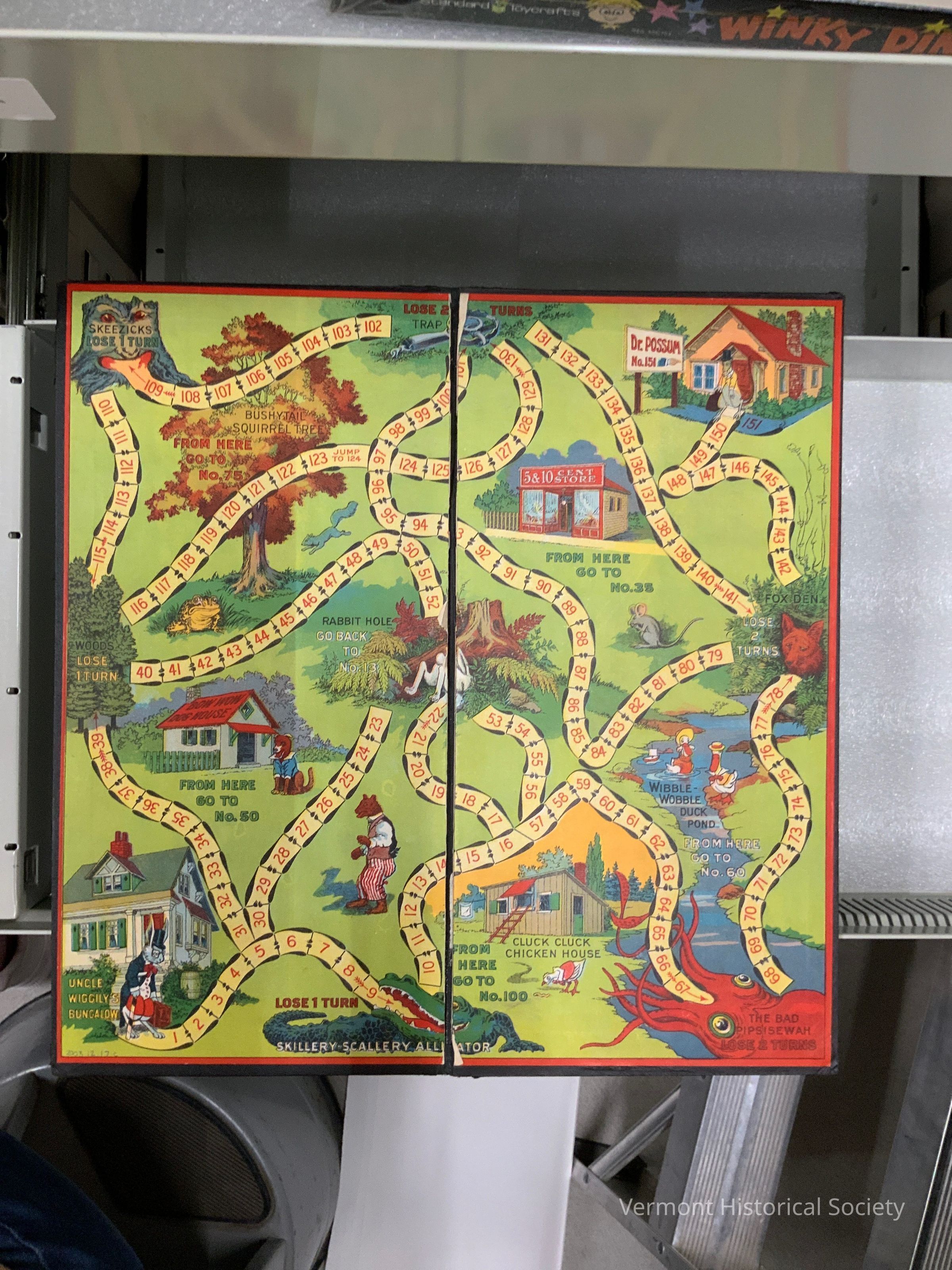 Board game, ""Uncle Wiggily" Game". The set consists of a box and lid, a game board, 95 white paper cards, 36 pink paper cards, 4 painted wooden disks. The board is printed with a twisting path that leads to various structures and characters. Instructions for play are printed on the interior of the box lid and consist of following the instructions on drawn cards.Context