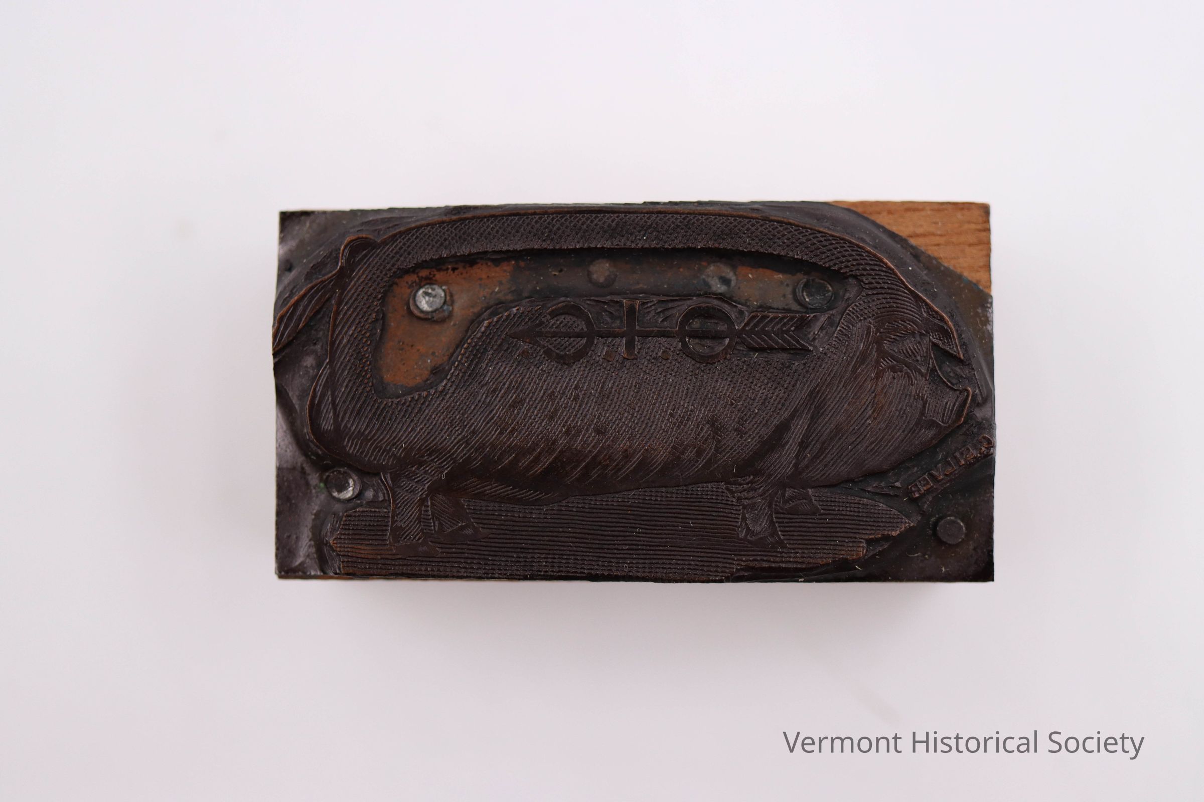Stamp consisting of an engraved metal sheet attached to a rectangular wooden block. The metal is engraved with an image of a pig with the letters "O.I.C." over an arrow at the center. The letters are made in reverse.Context