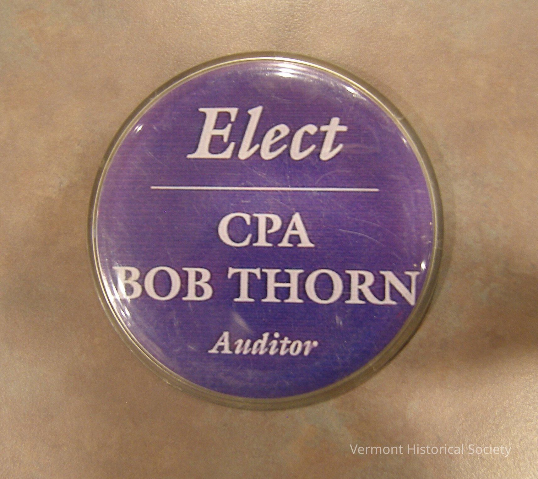 Made for the campaign of Bob Thorn for Auditor of Vermont. Given by him to Jim Milne. Robert Thorn was the Republican candidate for auditor in 1994, but lost to Democrat Edward Flanagan.