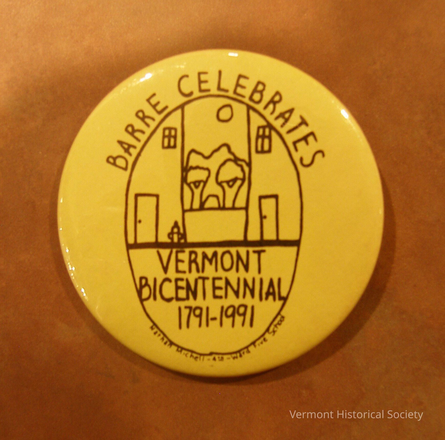 Round, lime green metal button printed with a naïve illustration of a a small park between two buildings and the inscription, "BARRE CELEBRATES VERMONT BICENTENNIAL 1791-1991". In tiny letters along the bottom of the image are the words, "Nathan Michell - A12 - Ward Five School".Context