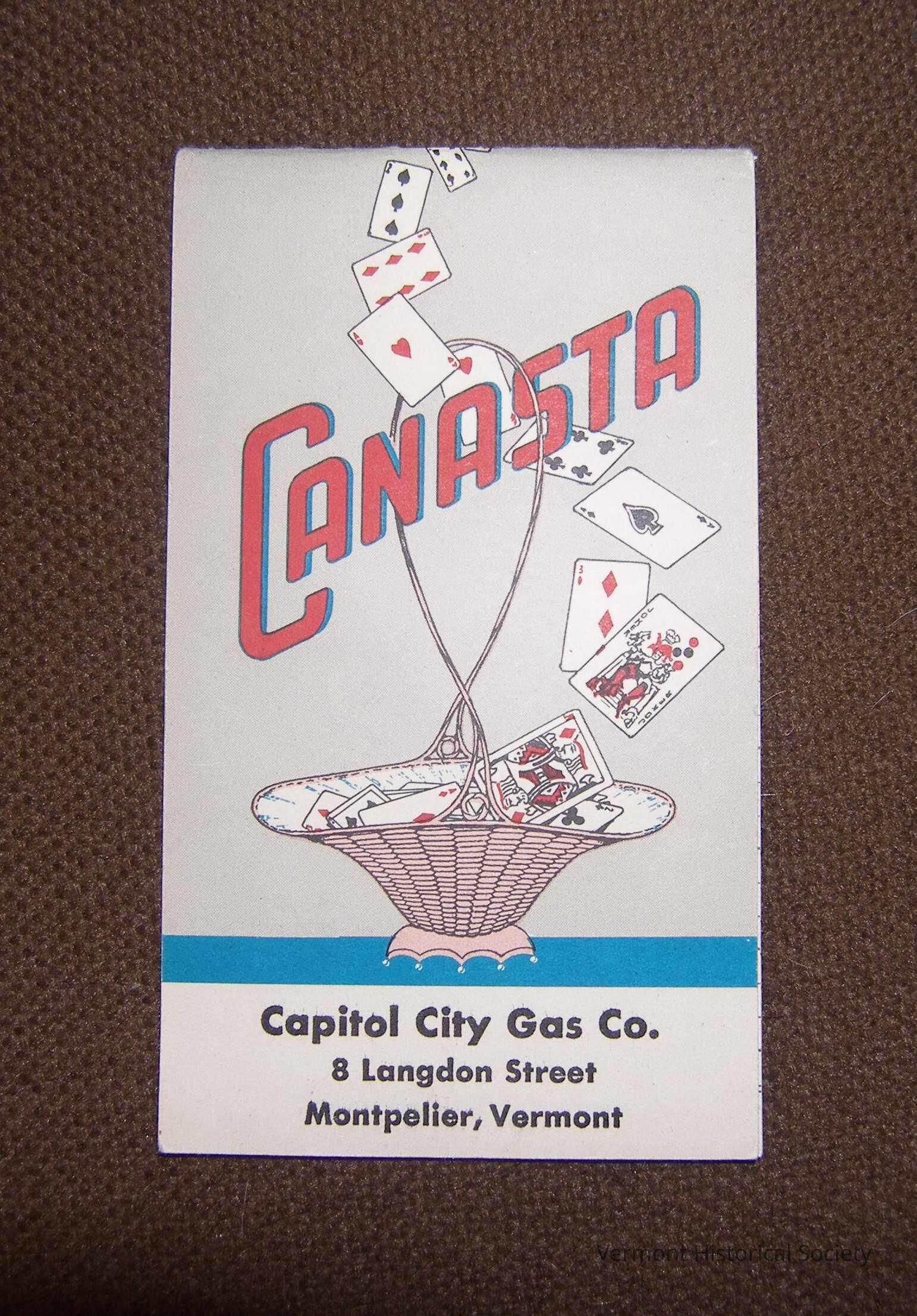Unused canasta scoring booklet. The cover is printed with the word "Canasta" over a basket into which playing cards are falling. The bottom of the cover is labeled, "Capitol City Gas Co. 8 Langdon Street, Montpelier, Vermont". The inside of the cover is printed with "Official Score Rules" listing the number of points for each bonus and for melding values. The pages are printed with a spreadsheet with columns labeled "WE", "THEY" (repeated once) and rows labeled "BONUS", "MELD", "TOTAL" (repeated 8 times).Context