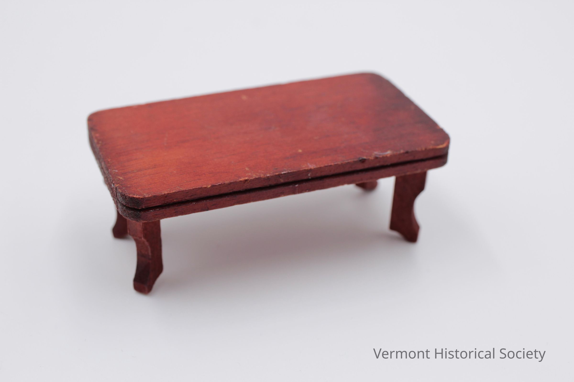Miniature dining table sized for a dollhouse. The table is made of wood and has a rectangular top and simplified cabriole legs.Context