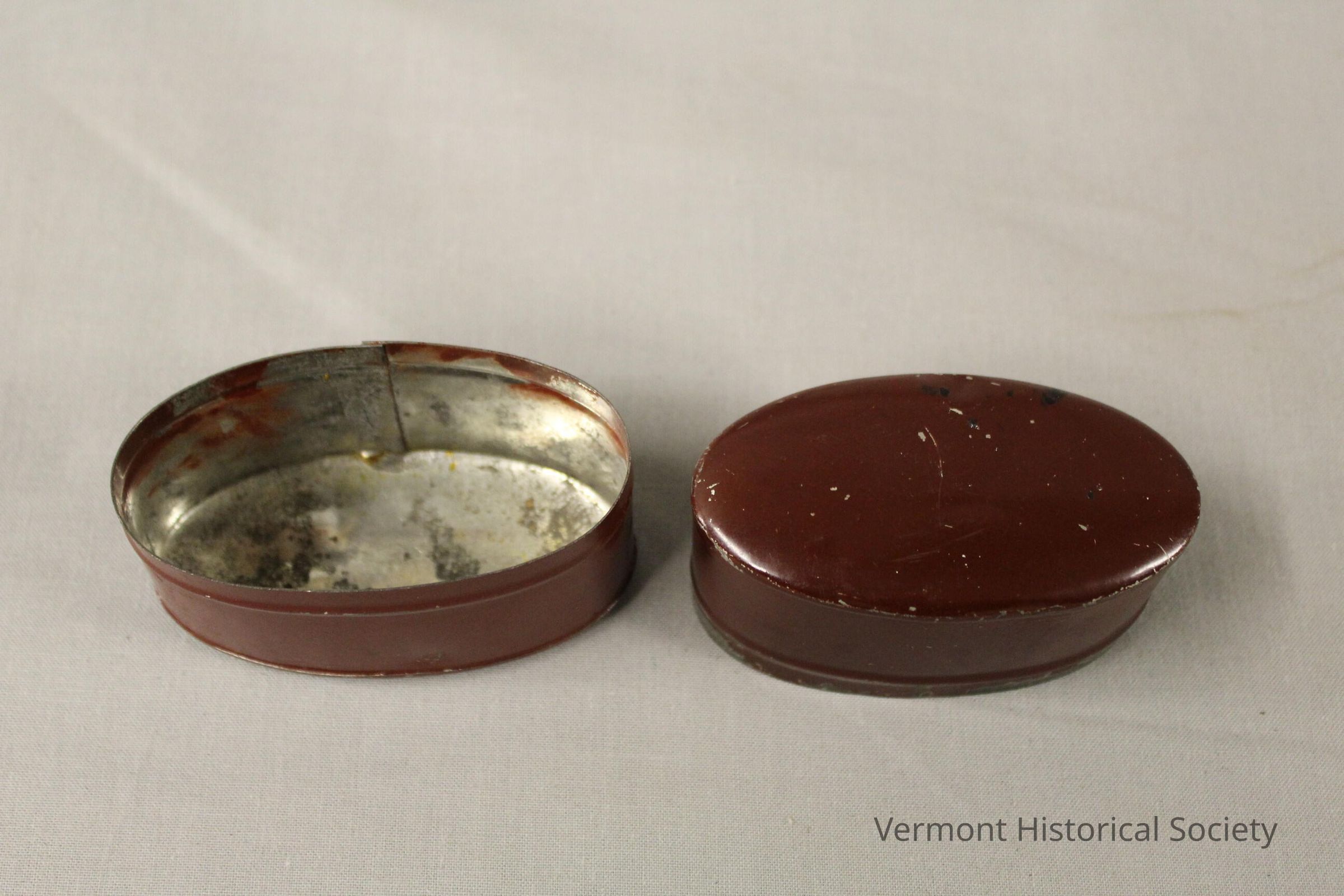 Small oblong metal case, painted red.Context