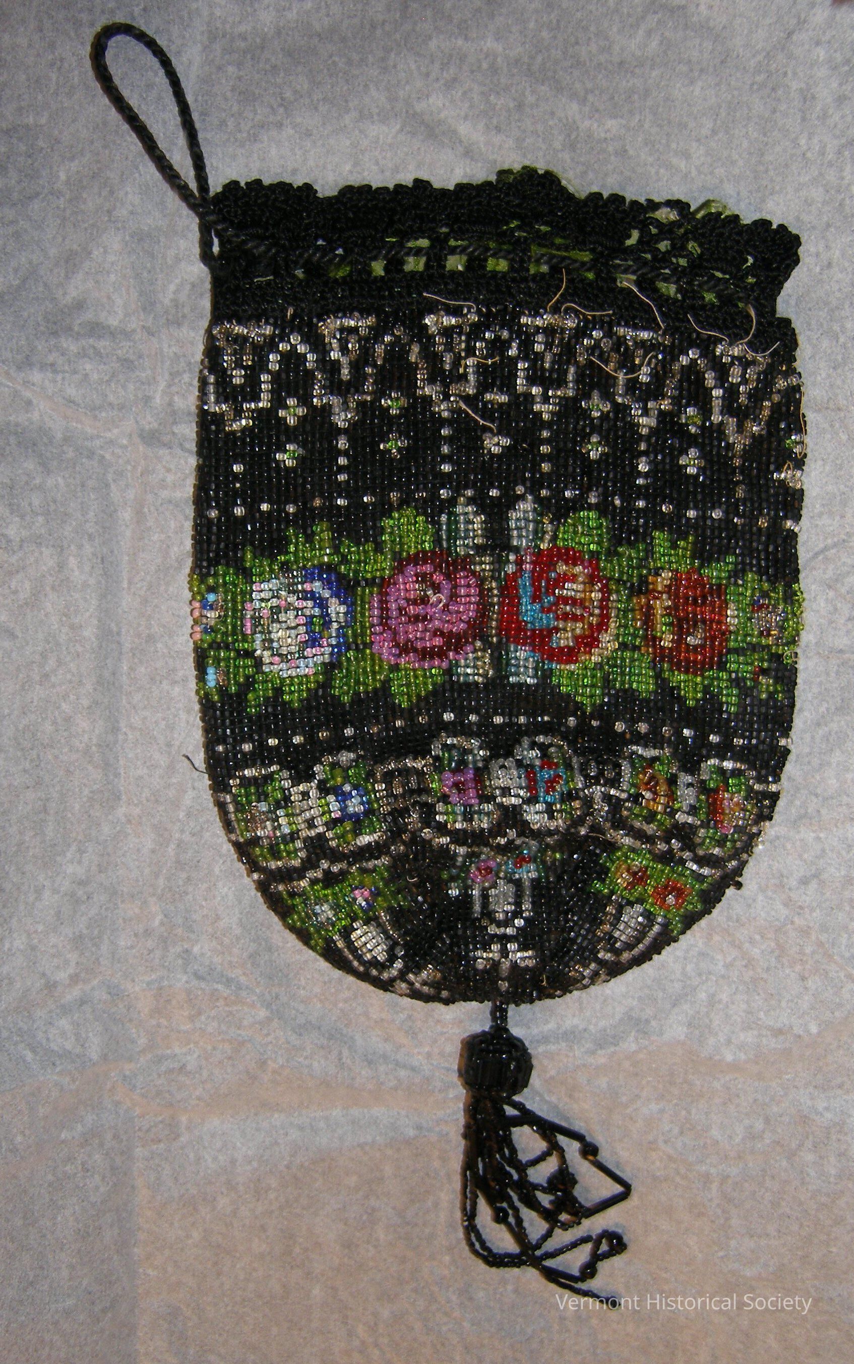 Small purse made of glass seed beads woven on cotton string. The beads form a floral pattern of roses, with gothic arches above and a floral band below. There is a beaded tassel at the bottom and black crocheted lace at the top. It is lined with green silk in a floral damask.
