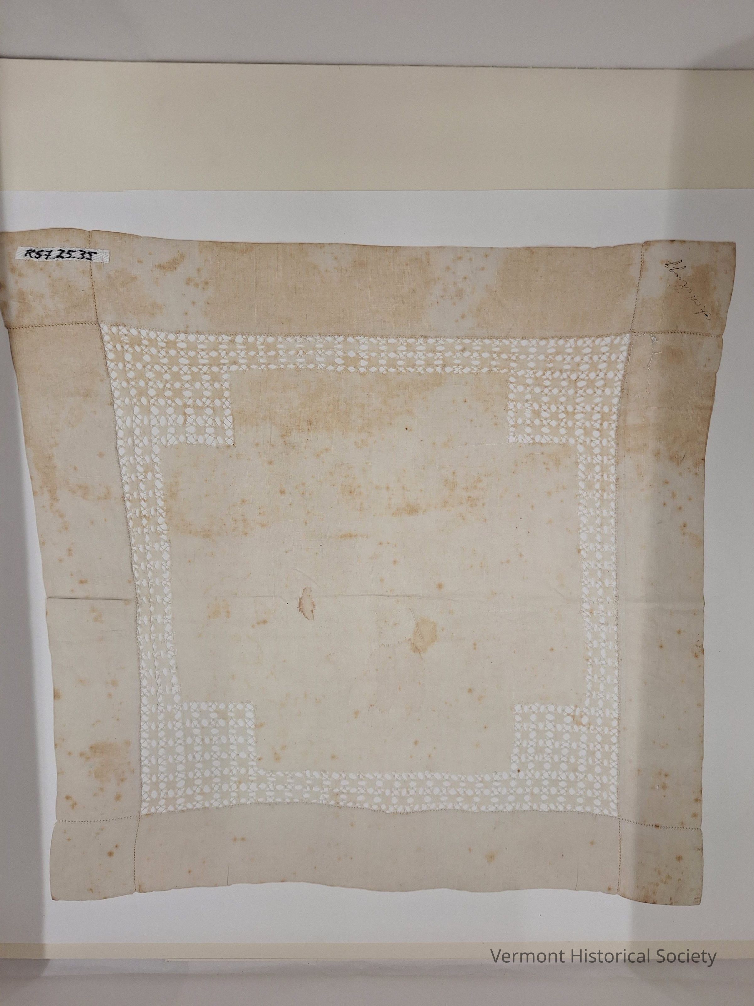 Linen square. Hand made, Italian cut embroidery. Mar: written on corner: A.A. Rugg 14-1/8"x13.75