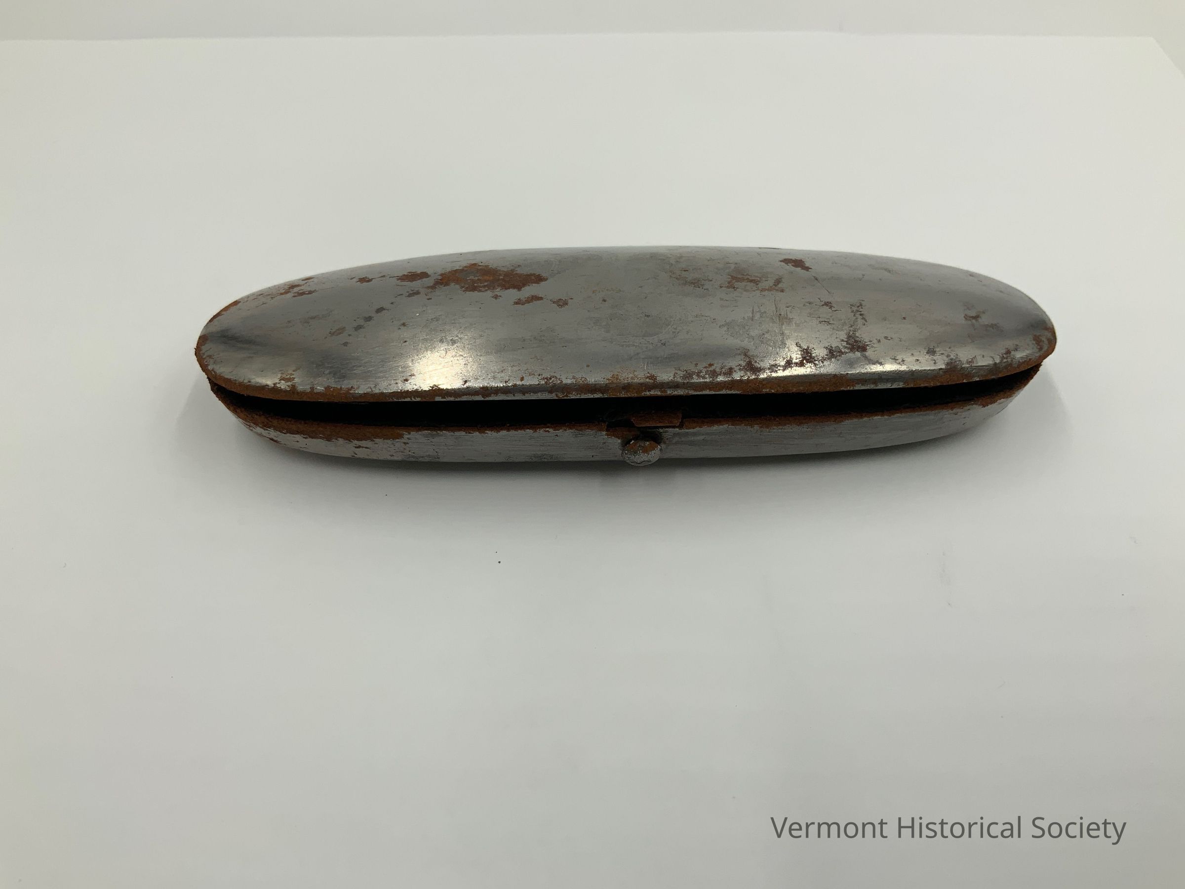 Metal clam shell style eyeglass case. The case hinges open on one side.