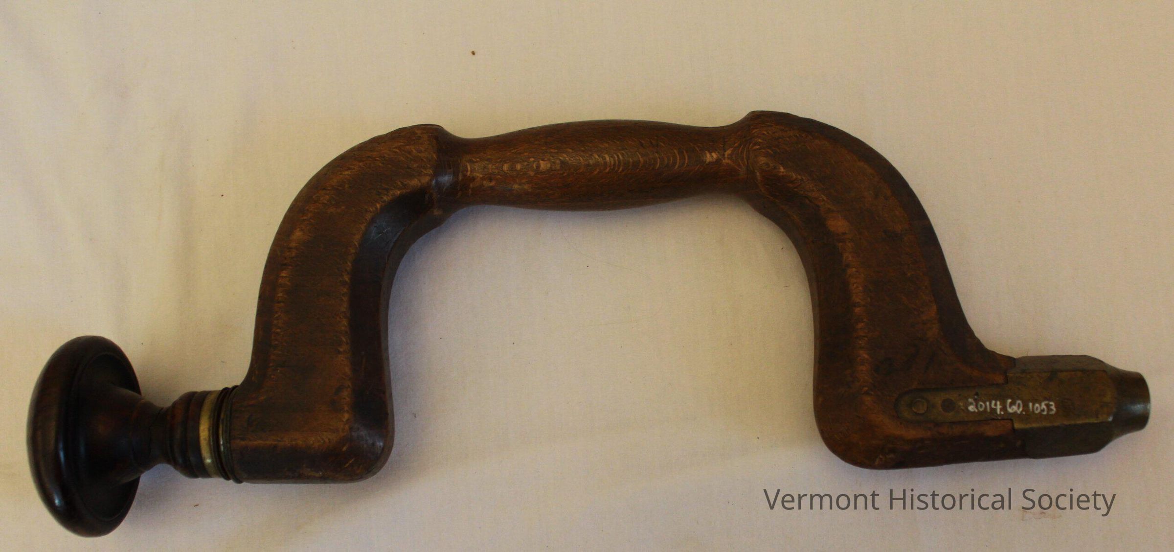 U-shaped wooden brace with a round knob on one end and a hole on the other end for holding a bit. The center of the "U" is carved into a rounded handle. There is a metal disk inlaid into the center of the knob and marked with, "W. Round".