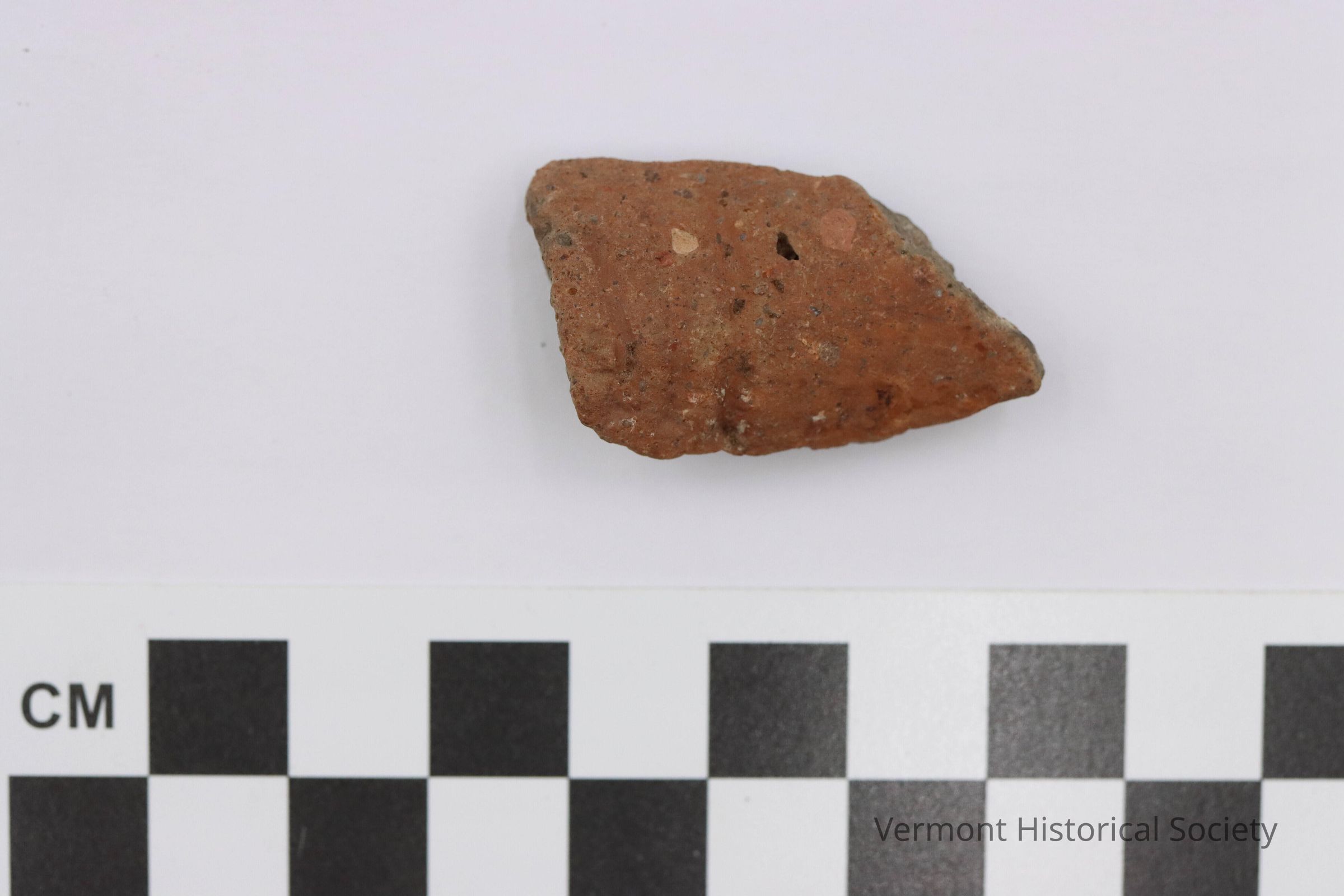 Fragment of a thick-walled pipe bowl. The bottom is outflaring, and there are three incised lines below the flat lip.