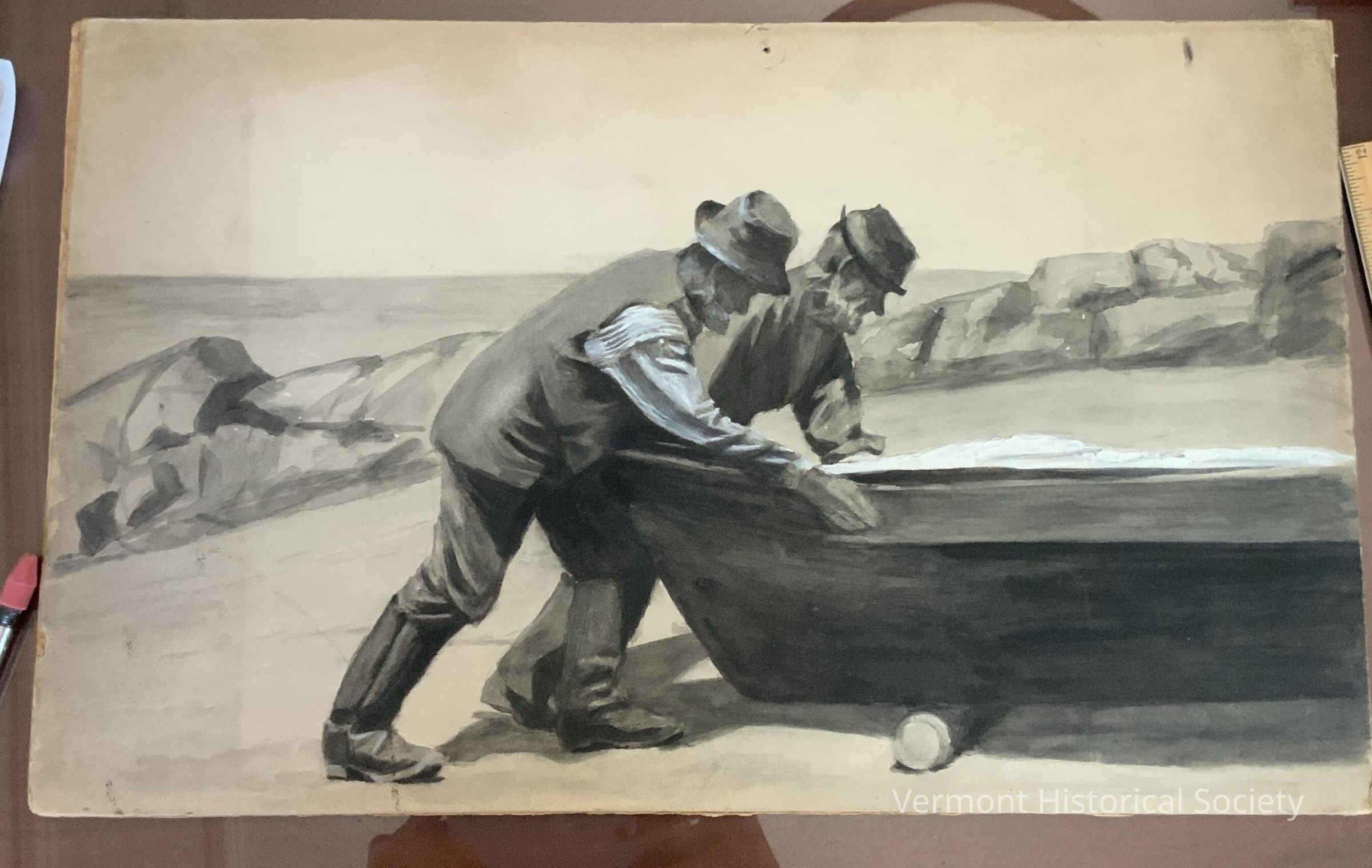A painting of two men pushing out a boat on a rocket beach by the sea. They both are wearing hats. It is painted in black and white. Unsigned and undated.Type of Painting