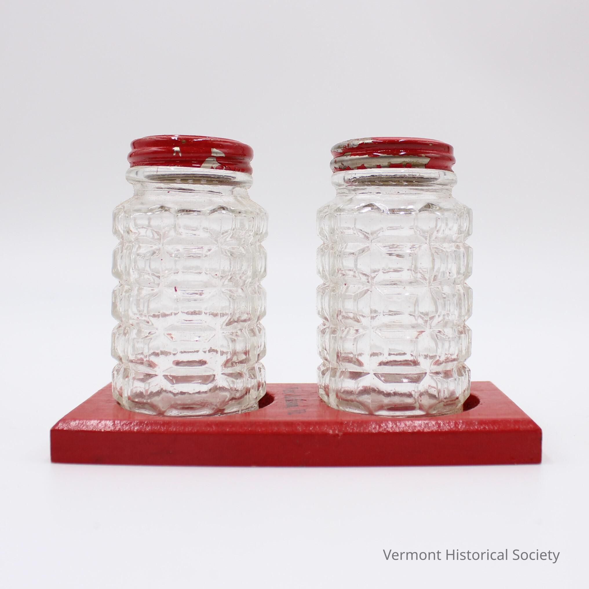 Two glass saltshakers with a red-painted wooden base. The shakers are clear, faceted glass with red-painted metal screw-on caps. The base is a rectangle with two holes drilled in the top, into which the shakers sit. The center of the base is printed with the words, "West Addison, Vt." The set is accompanied by its original cardboard box, which is printed with the label, "1 Pc. No. 369 Salt & Pepper Set Made In U. S. A."Context