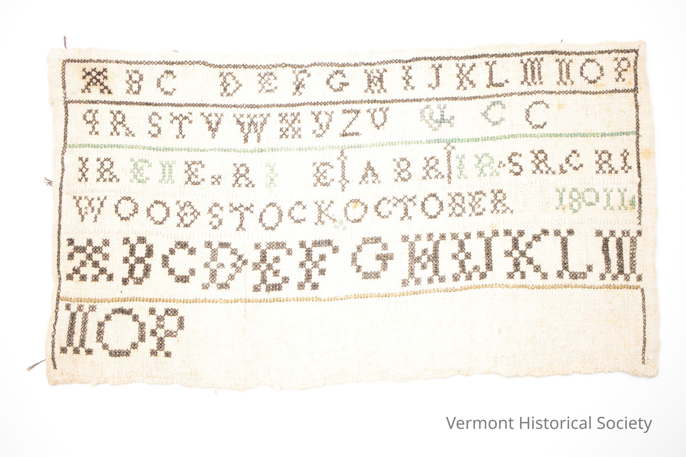 Small rectangular sampler with brown and green embroidery. The sampler has two marking alphabets, the first in cross stitches and the second in eyelet stitches. Between the two alphabets is the inscription, "IRENE RICE| ABR|IR.SR.CR|WOODSTOCK OCTOBER 18011".Context