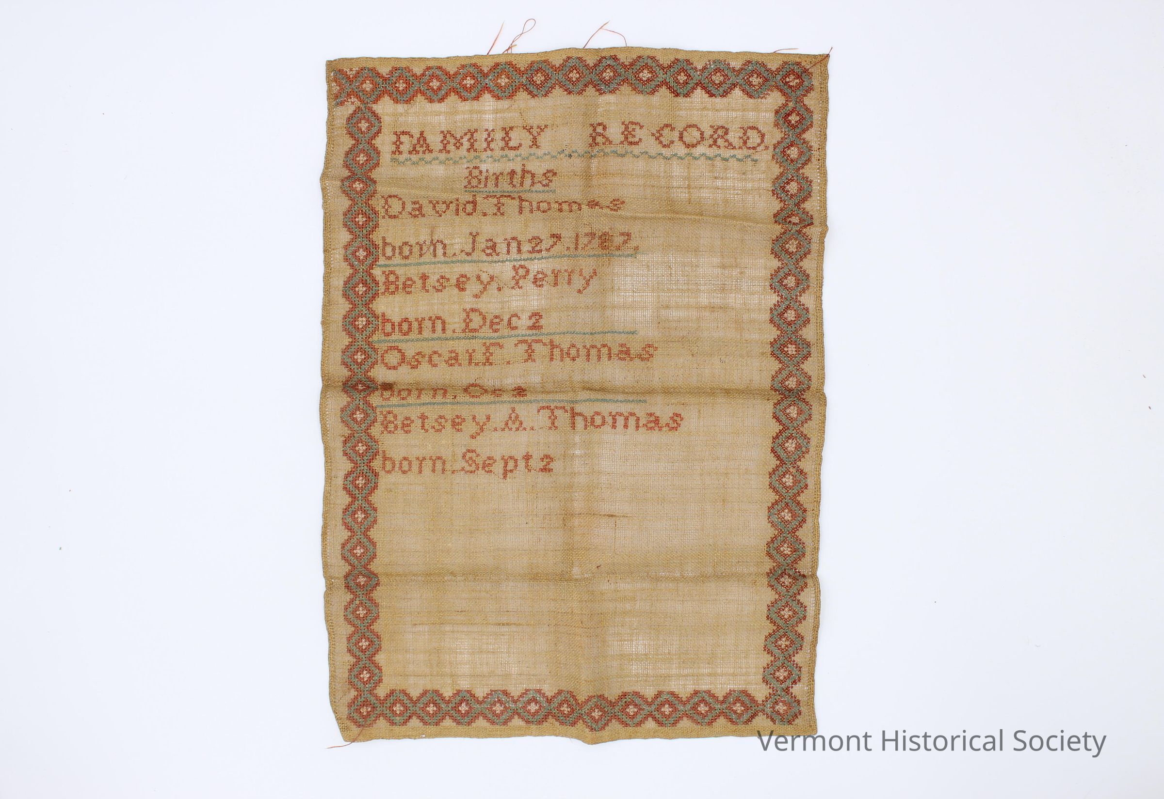 Sampler consisting of a brief, incomplete family record and a simple, diamond border. The sampler is stitched in two colors: red and aquamarine. The center bears the inscription, "FAMILY RECORD. Births David.Thomas born.Jan27.1787. Betsey.Perry born.Dec2 Oscar. F. Tomas born.Oct Betsey.A.Thomas born.Sept2", in cross stitches.The border consists of a repeated diamond pattern; the pattern extends outward at the upper left corner.