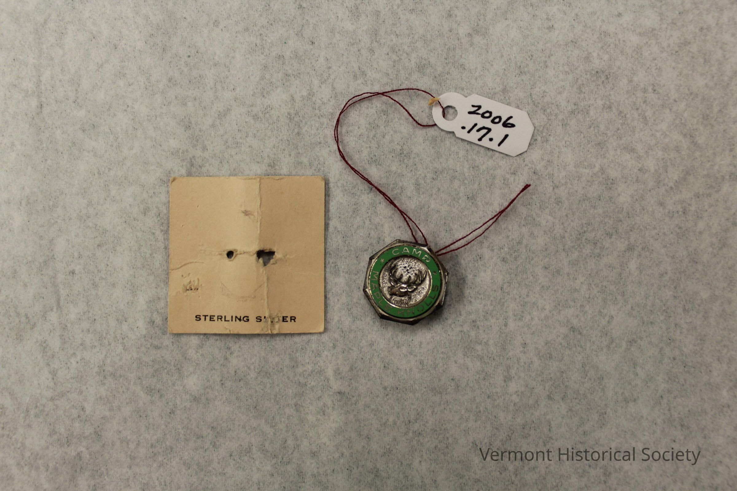 Silver hexagonal lapel pin with a safety clasp on the reverse. The front is molded with a stag's head in the center of an enameled green circle with the words, "CAMP MAPLE KNOLLS". The back is marked, "sterling". The pin was originally attached to a square piece of cardboard printed with the words, "STERLING SILVER".