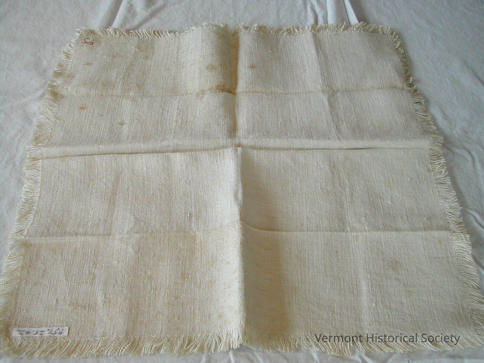 White, plain-woven linen napkin with fringe on all sides. There is a lower-case cursive L embroidered into one corner.