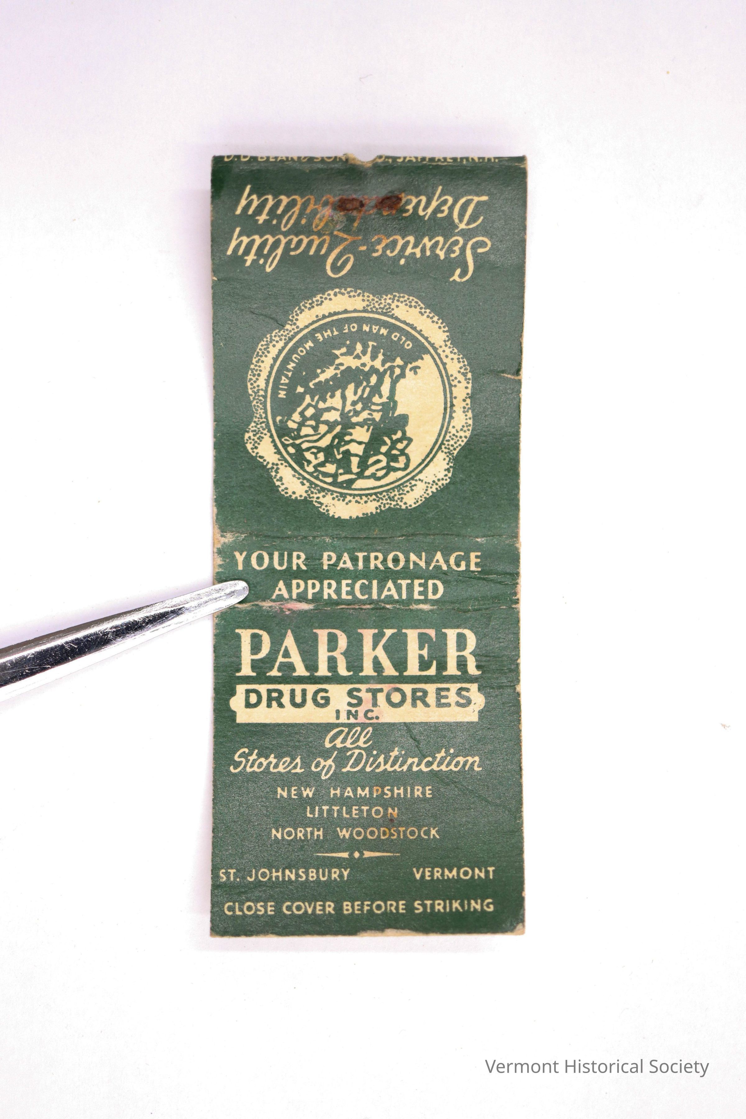 Green cardboard bifold matchbook. The front flap is printed with the inscription, "PARKER DRUG STORES INC. All Stores of Distinction NEW HAMPSHIRE LITTLETON NORTH WOODSTOCK -- ST. JOHNSBURY VERMONT".