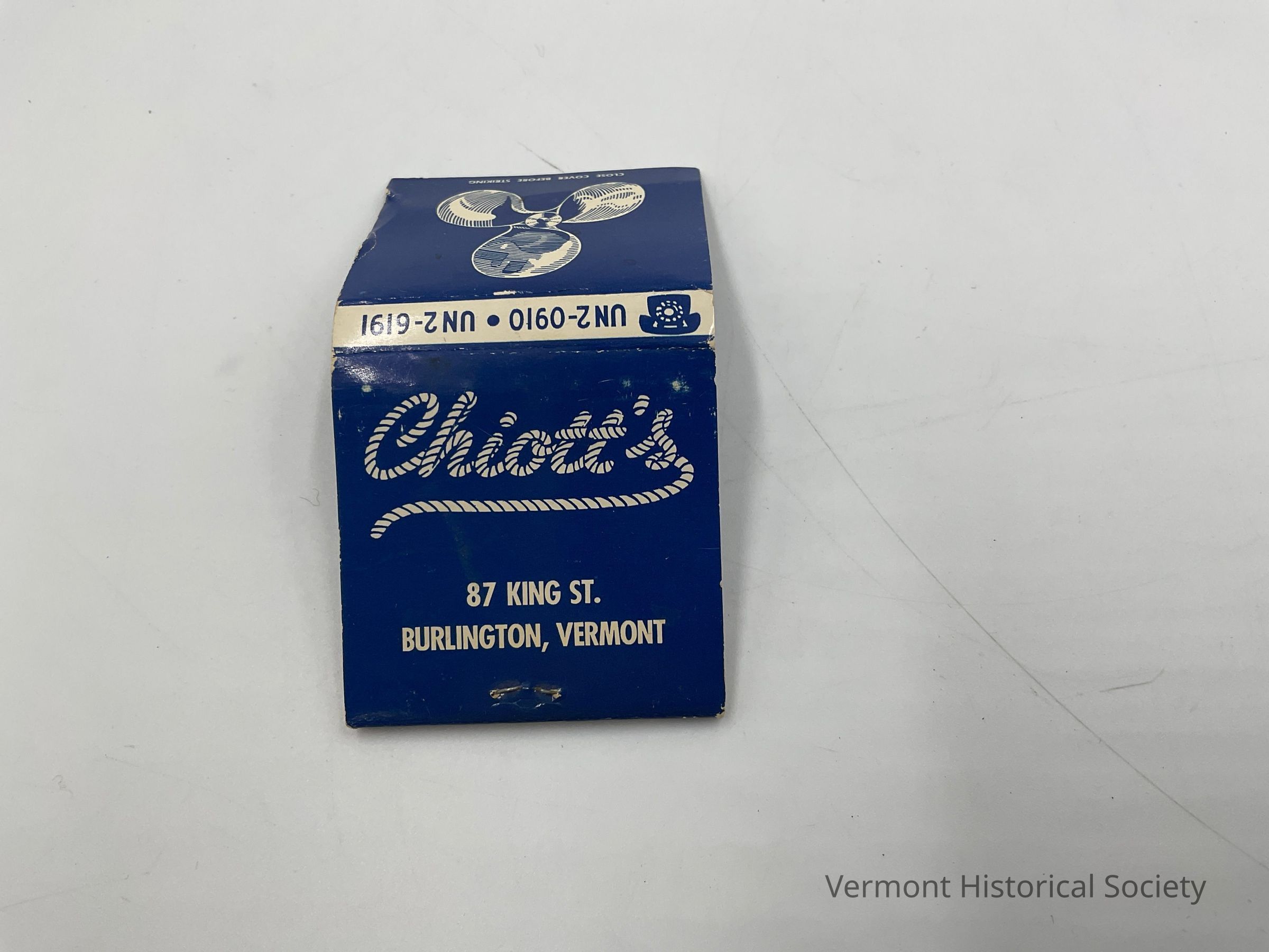 Blue book of matches with a boat propeller on the cover and an image of a helm on the blue matches inside. The inside of the cover reads, "Chiott's, Burlington, Vermont, The Complete Boating Supply House, Buy the Best for Safe Boating. On the back, the name is repeated, plus the address at 87 King St., Burlington, VermontContext
