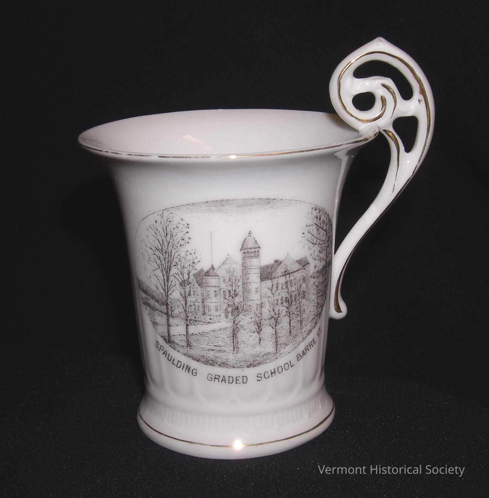White porcelain demitasse cup with ornate handle that extends above the rim of cup. The handle, rim and base are gilded. The cup is printed with an image of a large building with multiple towers. The image is labeled, "SPAULDING GRADED SCHOOL BARRE, VT." The bottom of the cup is marked, "MADE IN GERMANY FOR GEO. F. SCOTT & CO. BARRE VT."