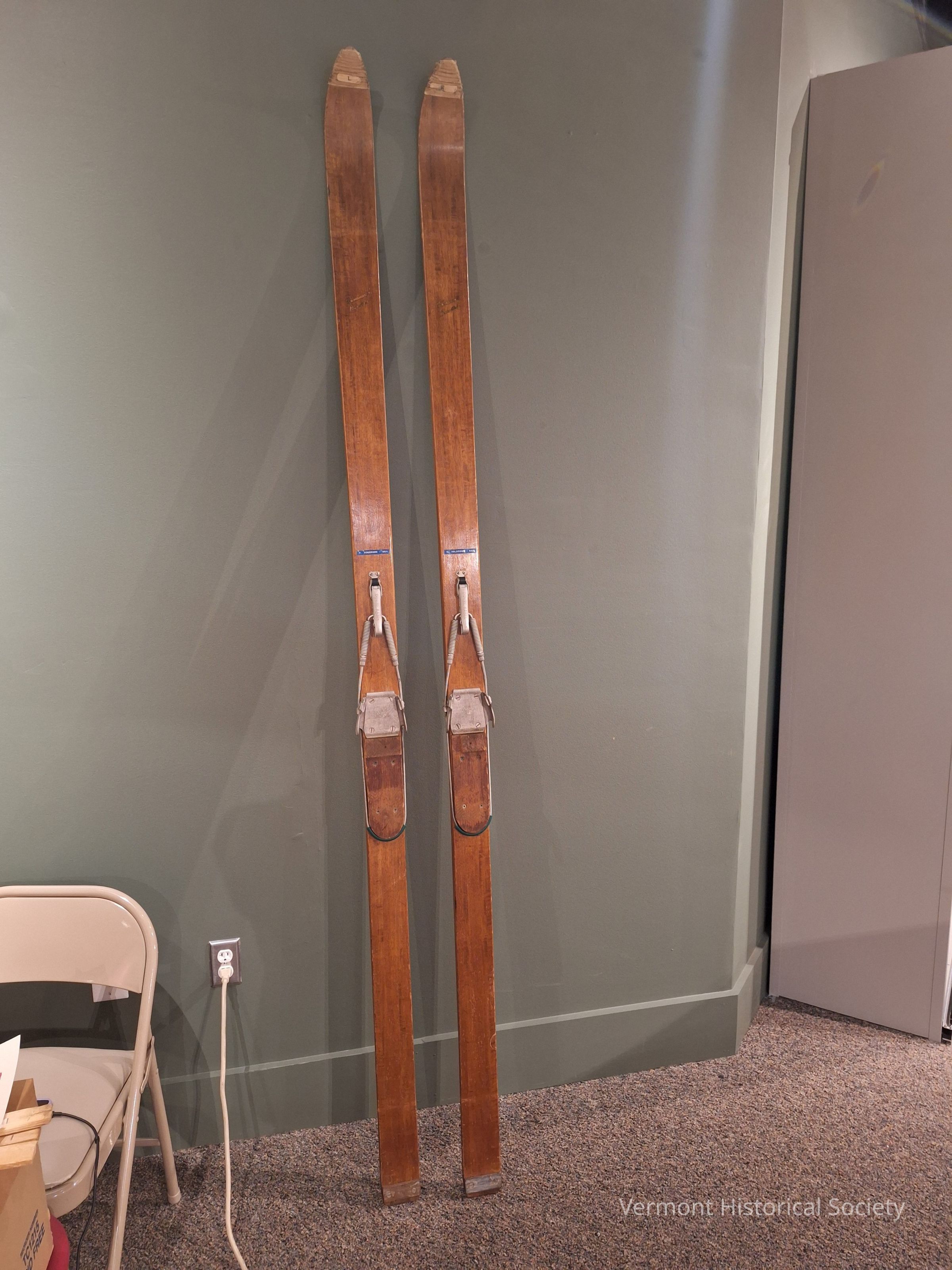 Used specifically for ski jumping alongside his boots (see 2024.17.47a-b) by Herbert P. Holbrook, a class A ski jumper and olympic cross-country skier. (see photo in archives) He was an alumnus of the Austine School for the Deaf, and admitted to the AAAD (American Athletic Association for the Deaf) in 1964, when he also made the New York Times News twice that year. He competed in Berchtesgaden (West Germany) in the 60's and in the Meribel Olympics in France in 1979.Acquisition