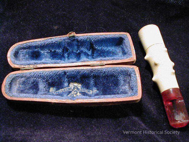 Meerschaum cigar holder with case. The holder is made white ceramic on one side, with a clear amber section on the other side. The central part is nubbed in imitation of corral. The case is shaped to fit the holder and is leather covered and lined with blue velvet.Context