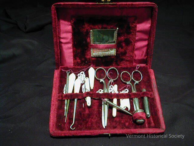 Square velvet box containing a variety of sewing tools. The tools are held into the case by a strap along the center that is stitched down at regular intervals, creating pockets. On the lid interior, there is a paper needlebook. On the lower side, (left to right) there is a pencil, an awl, a buttonhook, a penknife, an awl, scissors, a bone seam presser, a bobbin, scissors, a thimble, and a needlecase.Context