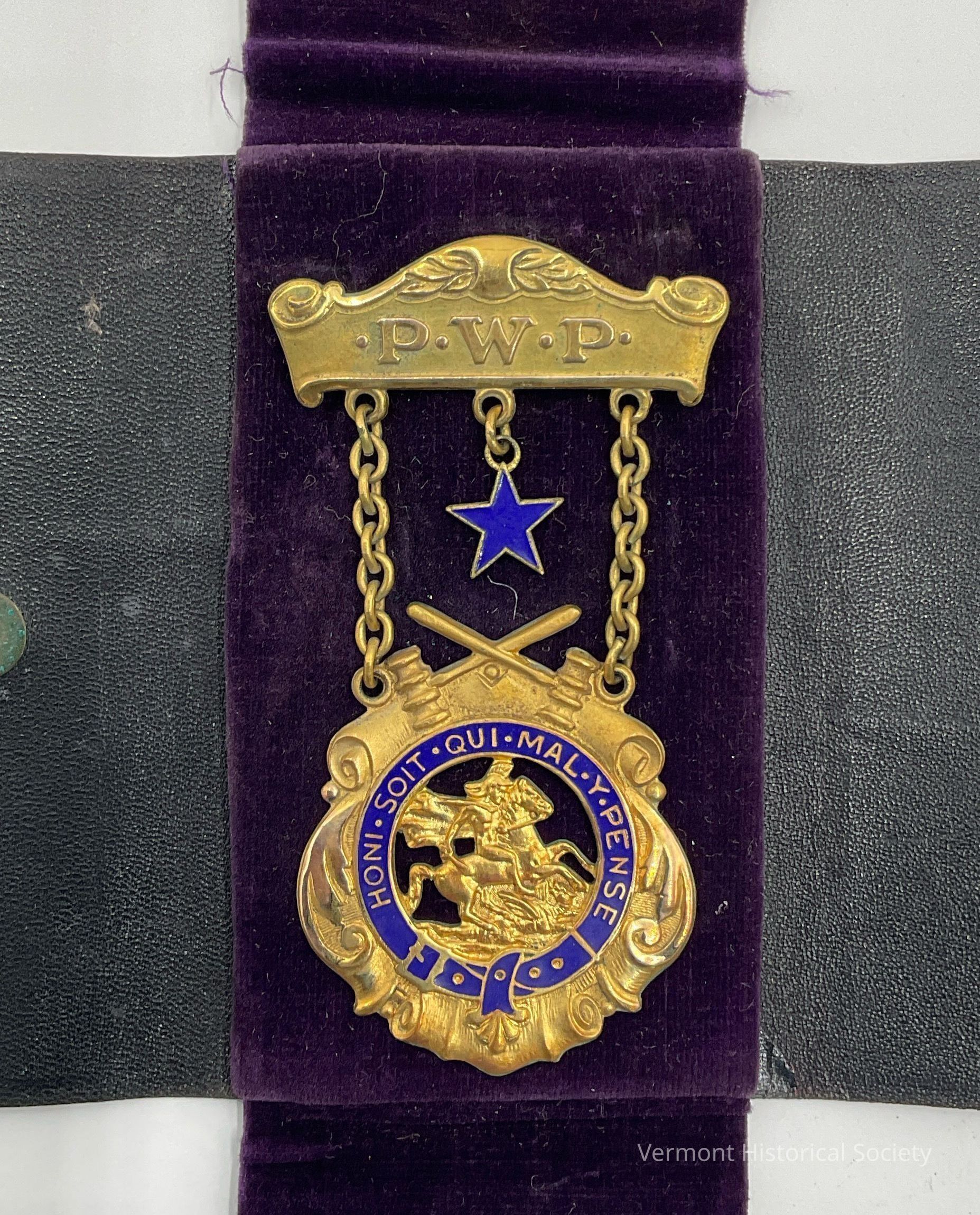 Membership badge consisting of a medallion hanging from a pin bar. The bar is shaped like a scroll and molded with the initials "P.W.P." A blue-enameled 5-pointed star hangs from the center of the bar. The medallions is molded at the center with an image of a man riding a horse. The image is surrounded by a blue enameled belt with the words, "HONI SOIT QUI MAL Y PENSE" ["Shame on him who think evil of it"]. The belt is surrounded by acanthus leaves and surmounted by crossed gavels.