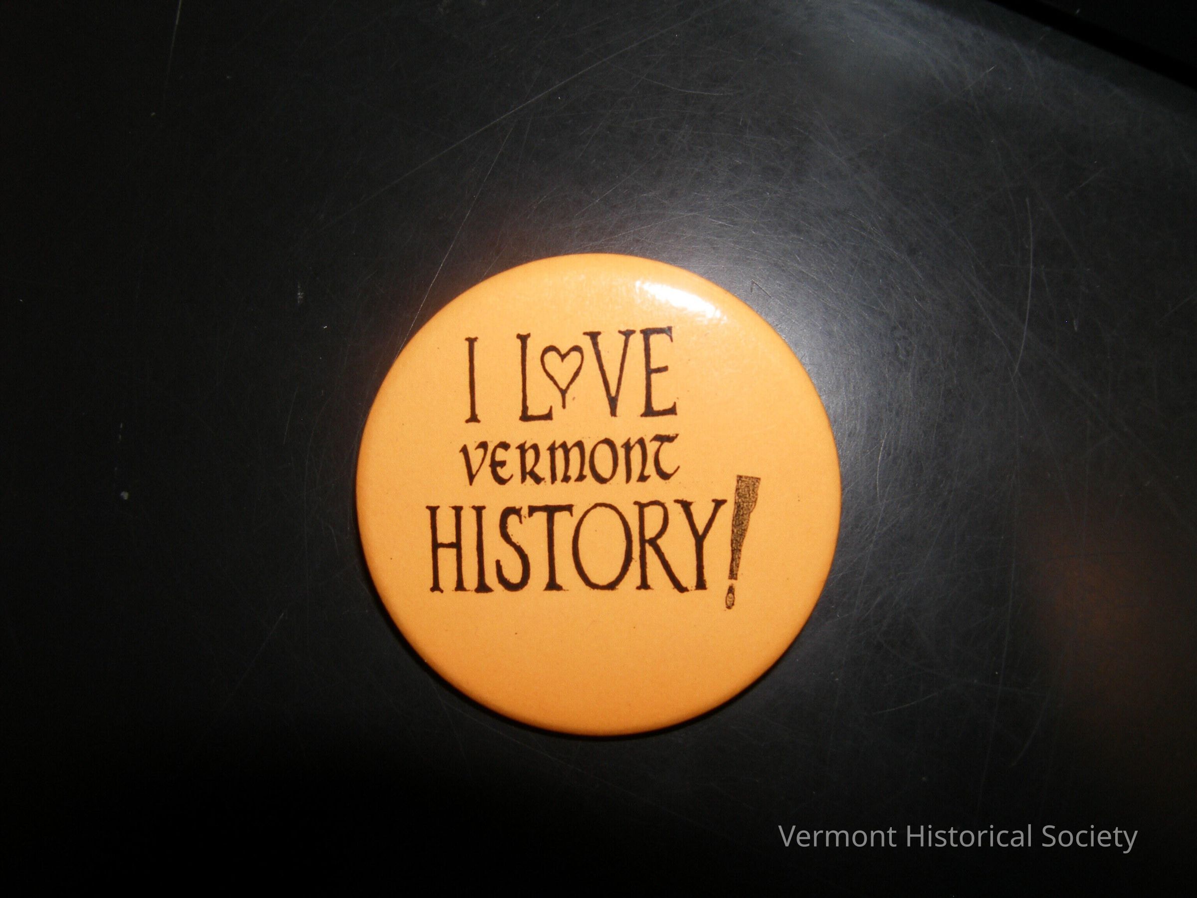 Round orange pin with the black inscription, "I LOVE VERMONT HISTORY!"Context