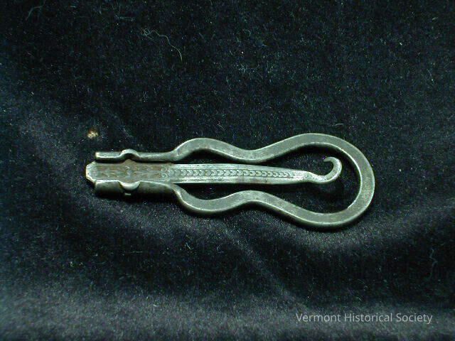 Foldable buttonhook. The handle is shaped like a violin and is hollow on the inside, allowing the hold to fold into the center.