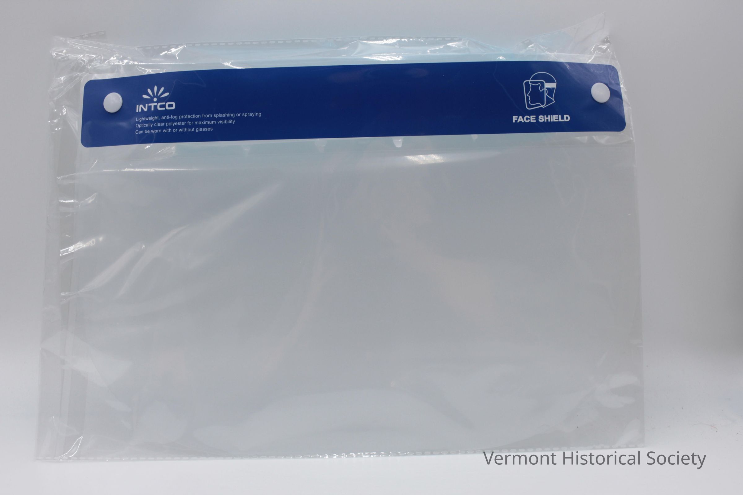 Rectangular piece of clear, flexible plastic with a blue label across the top illustrating how to wear the face shield. At the back of the label is a pad consisting of five blocks of soft blue foam and a white elastic strap attached to either side of the shield with plastic rivets. The shield is within a sealed plastic pouch.