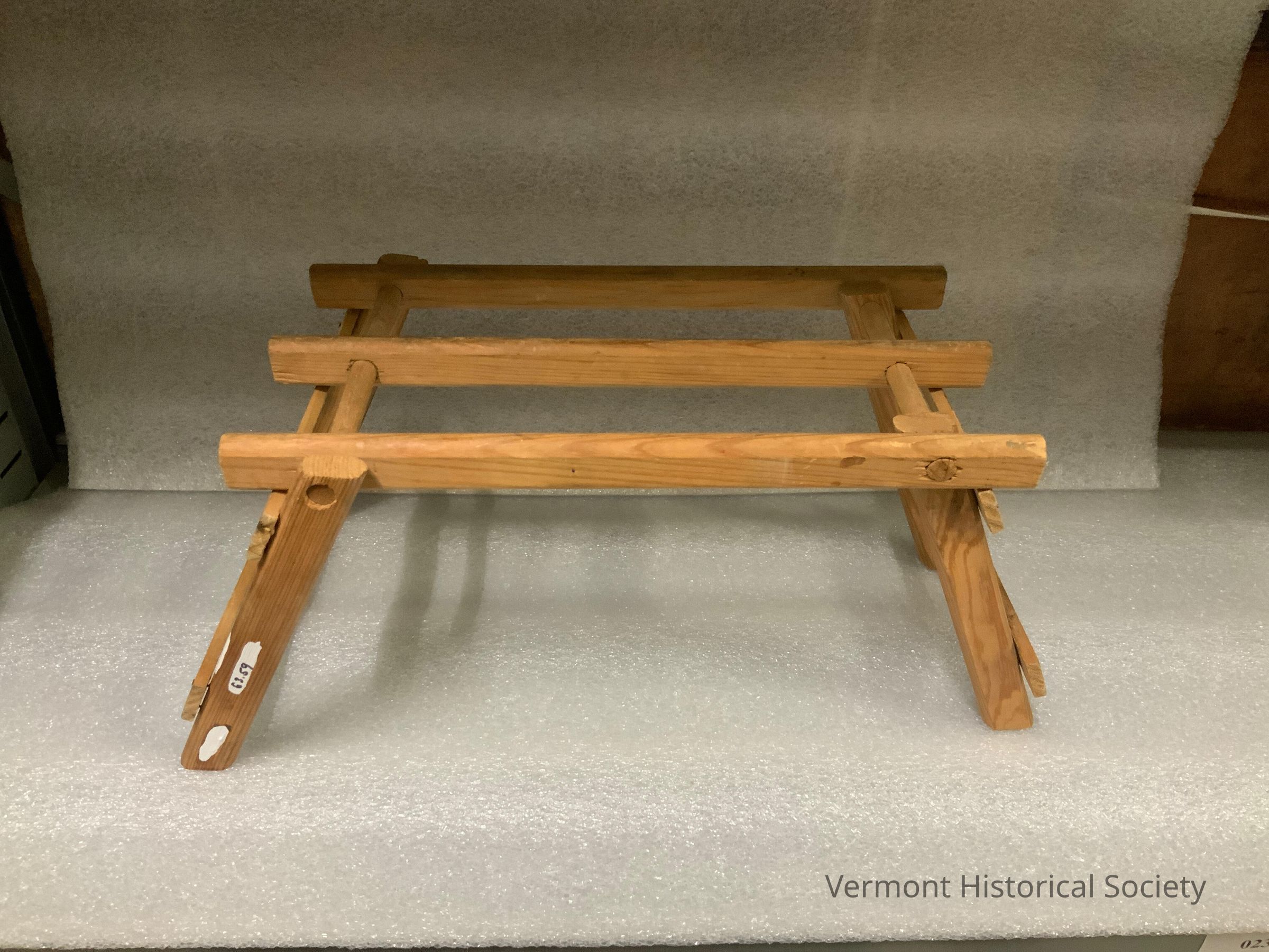 Bench for a child's wash tub. Made of wood, 3 slats of wood on the top that fold under. Legs are braced in two places.