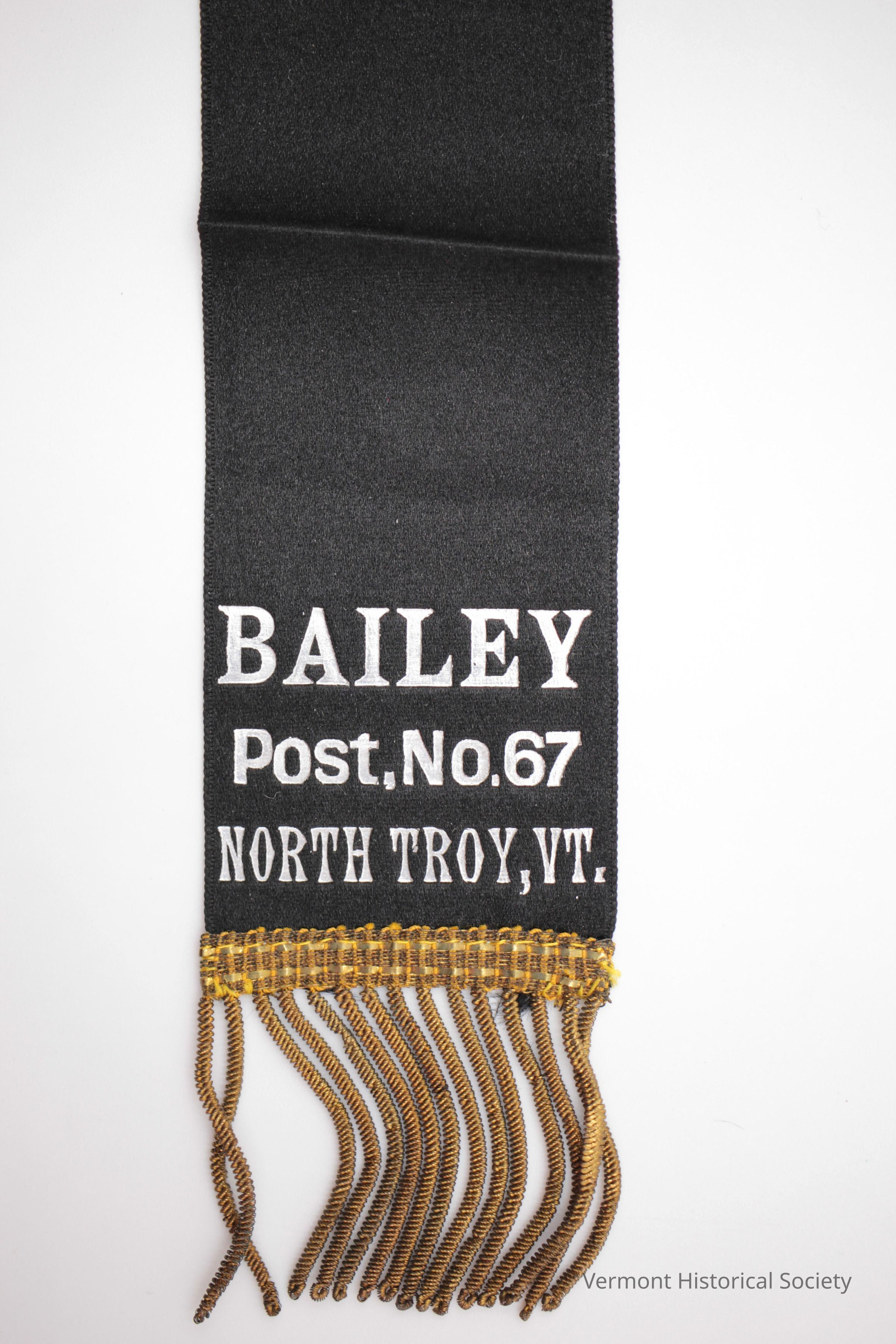 Black ribbon with gold fringe. Silver lettering on the ribbons says, "Bailey, Post, No. 67, North Troy, VT.Context