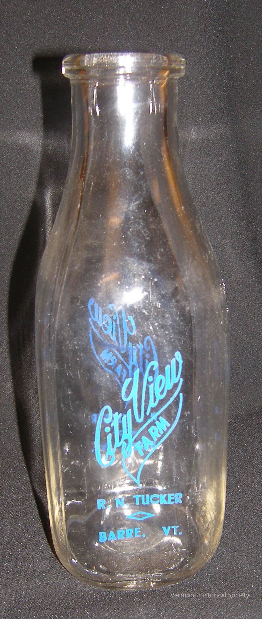 Clear glass quart size milk bottle, square sides, round neck and lip. Blue lettering states: City View Farm/R.N. Tucker/ Barre, VT" on opposite sides of the bottle.Acquisition