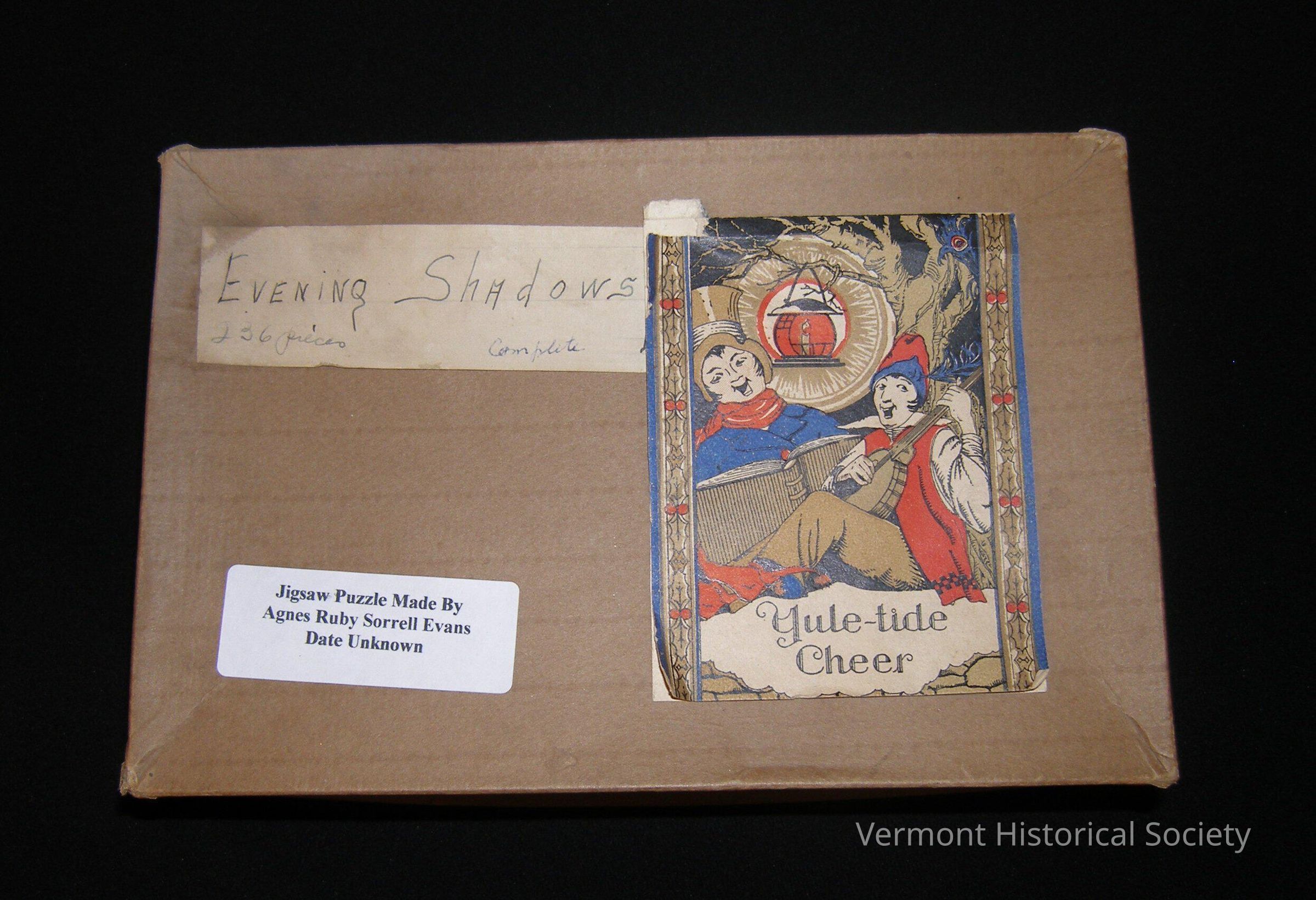 Wooden jigsaw puzzle. The puzzle is in a cardboard box with the hand-written label, "Evening Shadows", and a Christmas card on the lid. The car shows a lute player and a singer with the words, "Yule-tide Cheer". The puzzle has 236 pieces cut into abstract shapes unlike modern puzzle piece shapes.Context