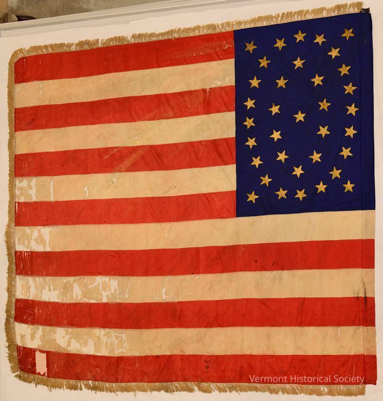 National flag issued to the 9th Vermont Infantry Regiment. Stars arranged in double ellipse on blue canton.