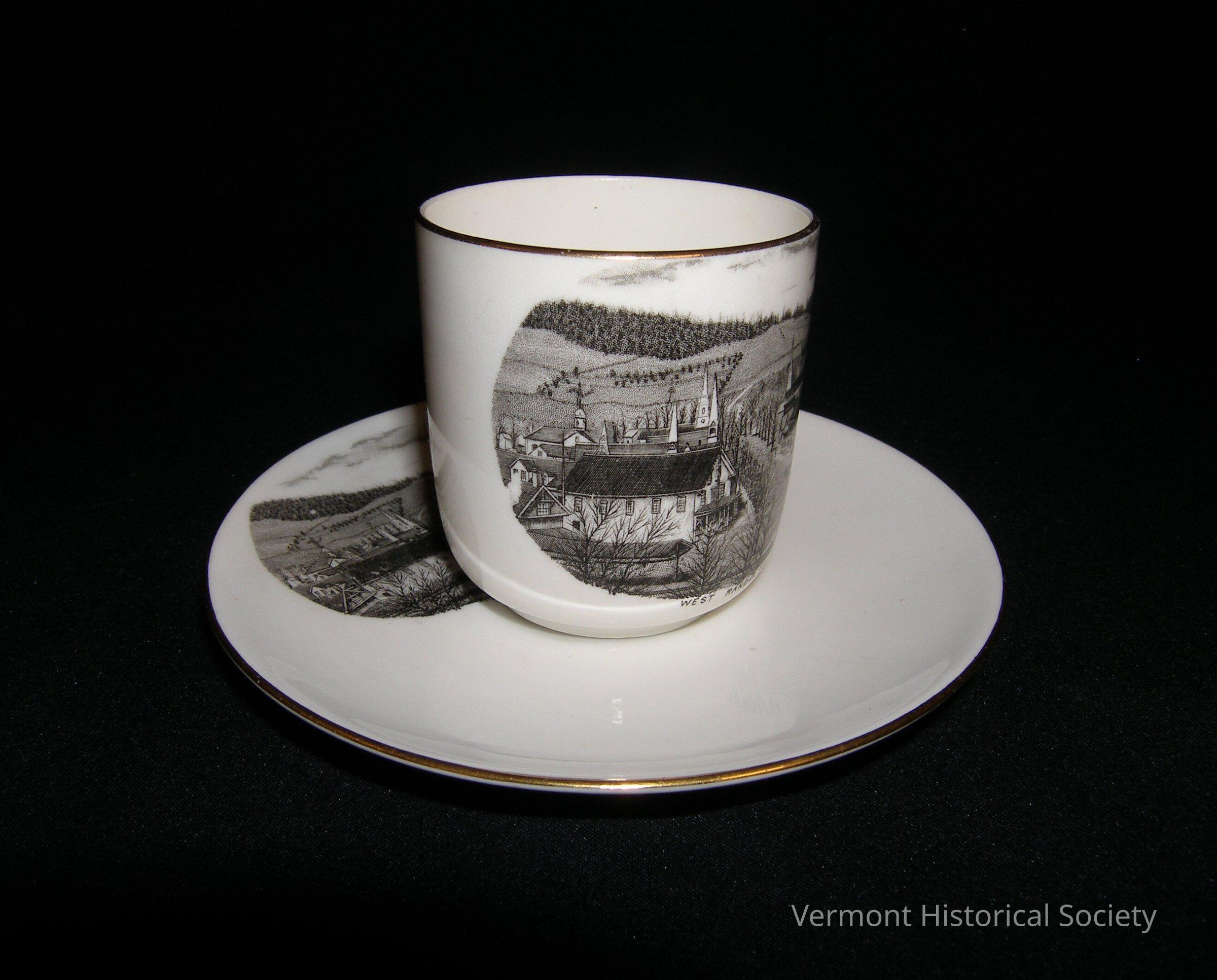 White ceramic demitasse cup printed with an illustration of a town street lined with buildings. The image is labeled, "WEST RANDOLPH, VT." The bottom is marked, "Made in England W. E. Lamson West Randolph Vt."