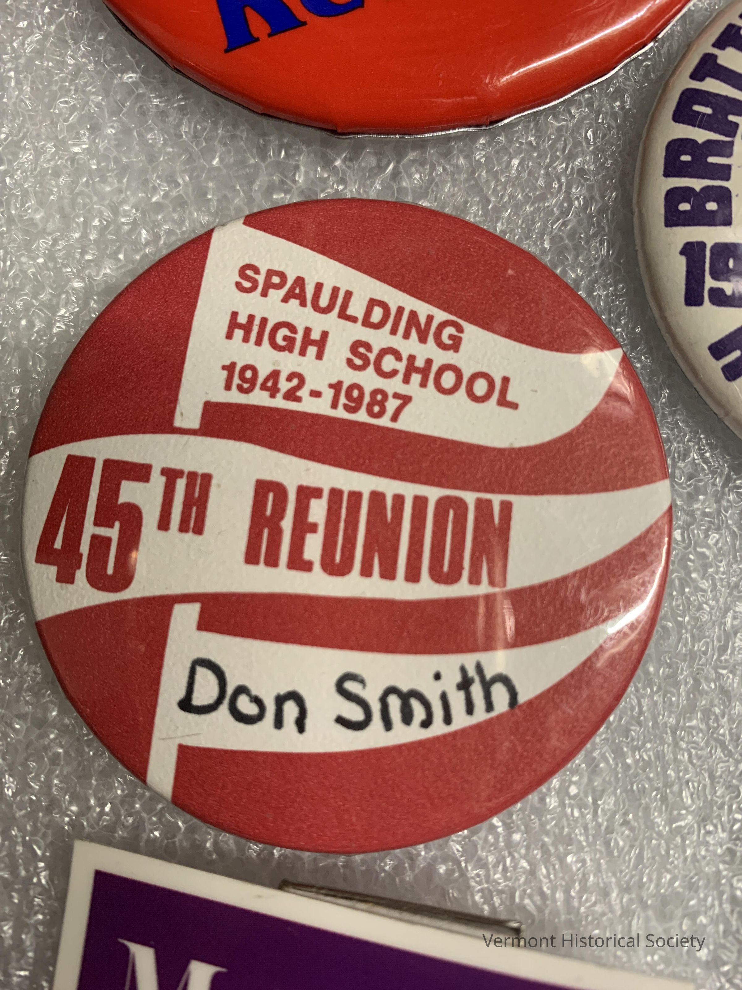 A red and white pin with three white banners on the red background. The top says, "Spaulding High School 1942-1987." The middle, biggest banner, says, "45th reuinion." The bottom has the name, "Don Smith" hand printed in black marker.Context