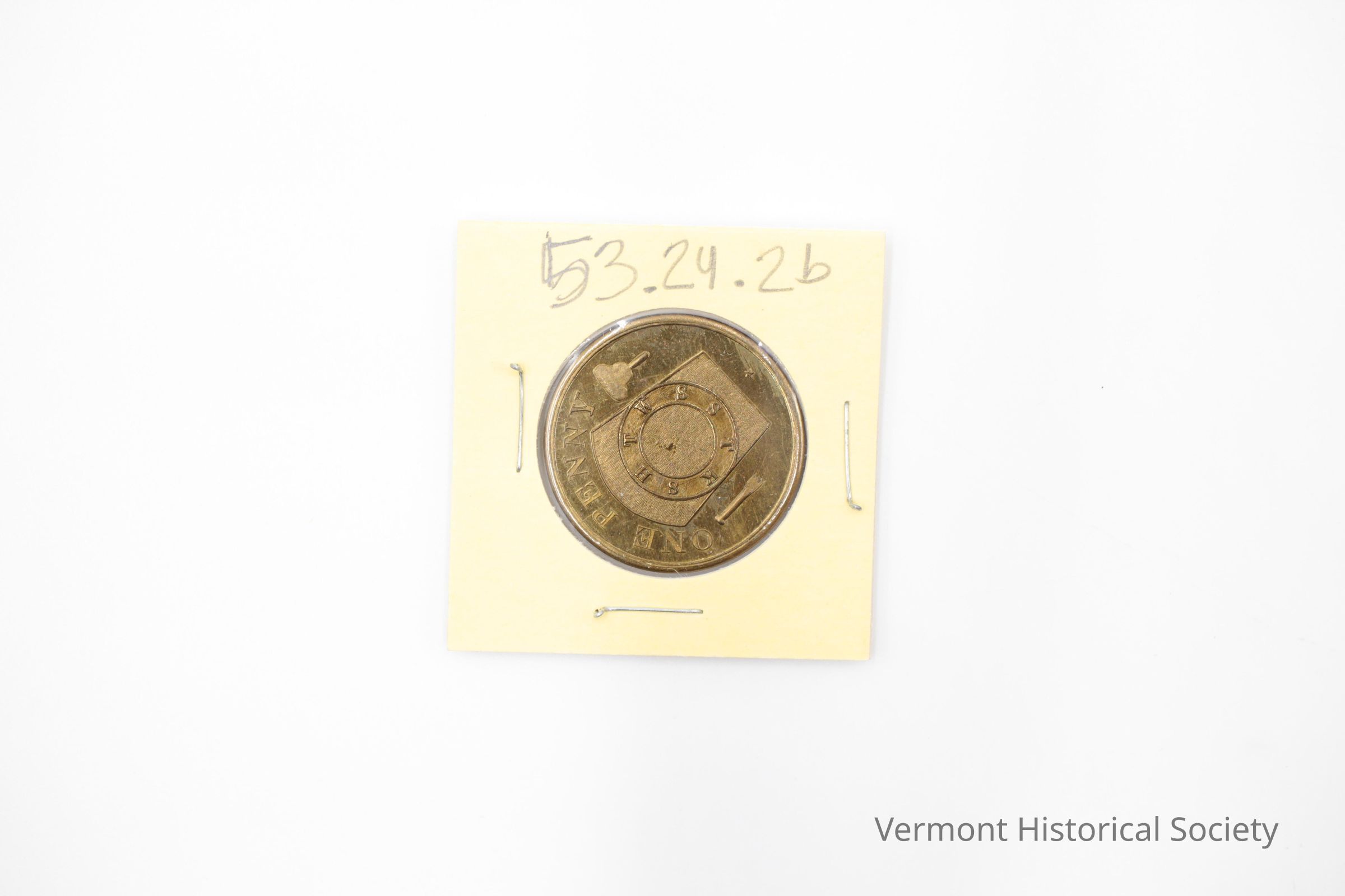 Bronze token the words "ONE PENNY" on the obverse with an olive branch at the bottom, a tablet with a circle of initials "H T W S S T K S" in the center, a chisel, and a funnel. On the other side of the coins are the words, "Cleveland Chapter No. 20 R.A.M. Newport, Vt.Use