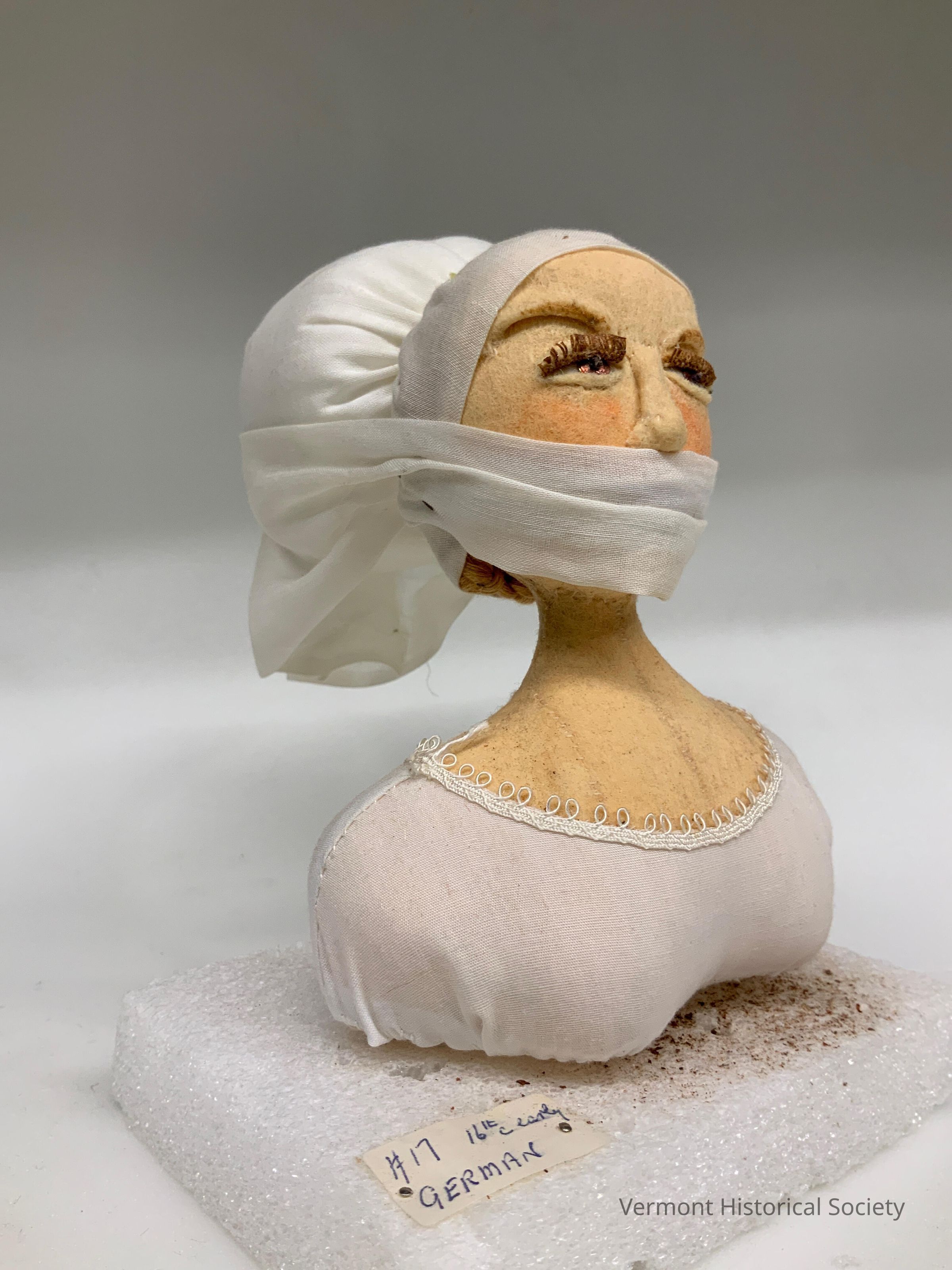 The bust is wearing a headdress consisting of white cotton wrapped tightly around the head and held in a large, padded bun at the back. A strip of fabric runs across the bottom of the face, under the nose, and is pinned to the sides of the cap.