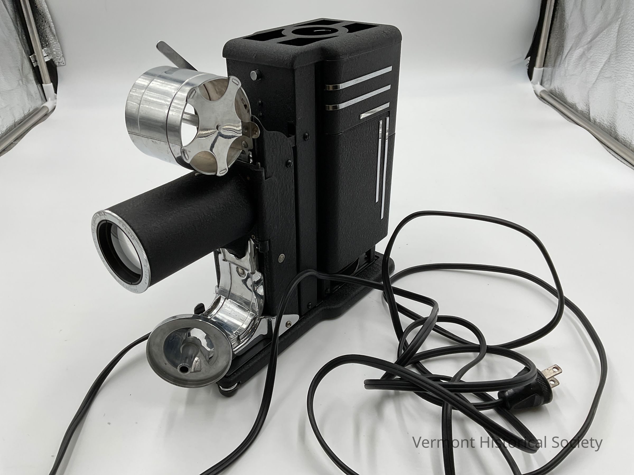 Accompanying the projector is a black case with a hinged top and a leather handle. Inside the case, there are felt pads to provide protection. There is also a padded compartment, although it is too narrow to accommodate a spare light bulb. Additionally, there is a metal tin designed to hold a coil of filmstrip. The tin has a gold color and is labeled with the word "Vermont" on the top. Lastly, a spare light bulb is included for the projector. This bulb features a brass-colored connection base, a large wire filament, and a black cap on the top. It is worth noting that there is an identical bulb already inside the projector.Context