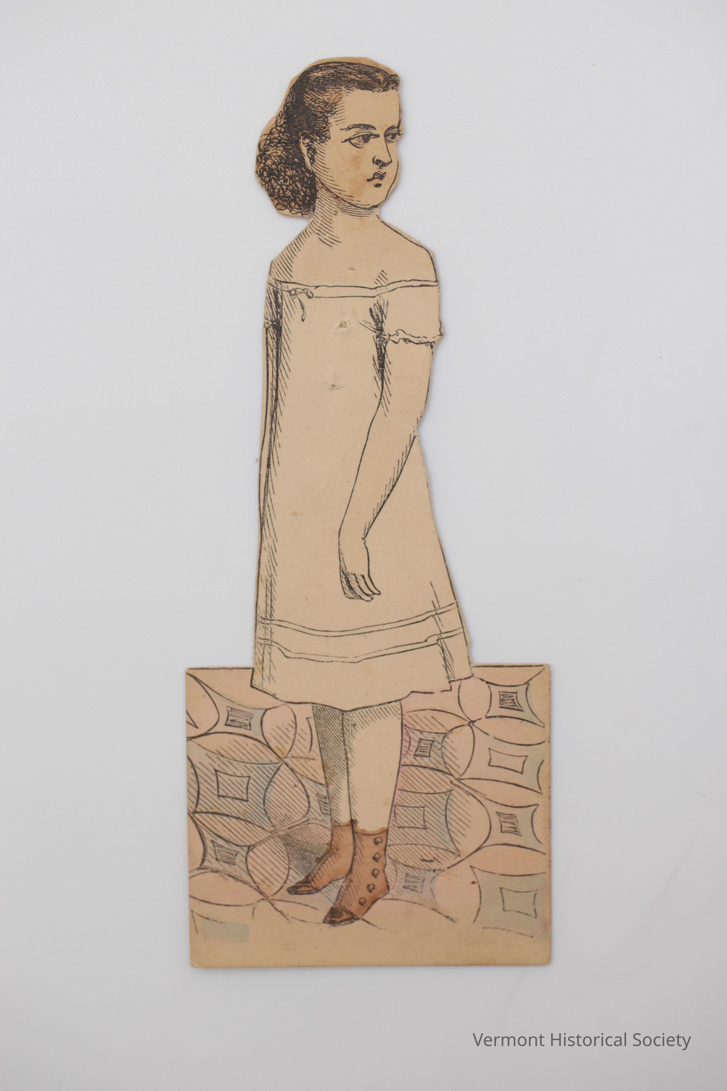 Paper doll showing a child with brown hair tied behind her head. The doll is wearing a chemise and brown boots. The base is a square of carpet in an oval and diamond pattern.