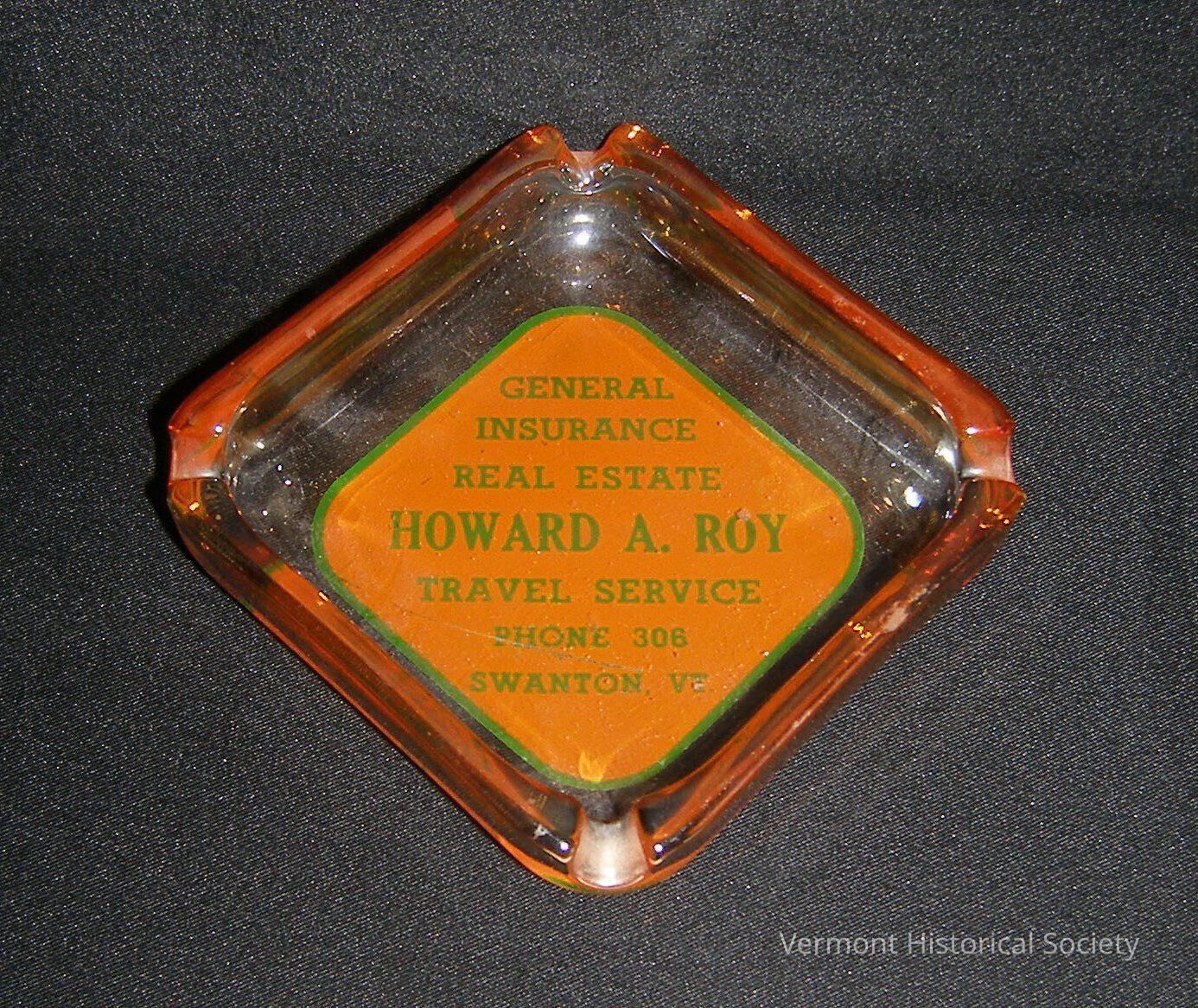 Orange square glass ashtray printed in green on an orange square in the base with the label, "GENERAL INSURANCE REAL ESTATE HOWARD A. ROY TRAVEL SERVICE PHONE 306 SWANTON, VT."