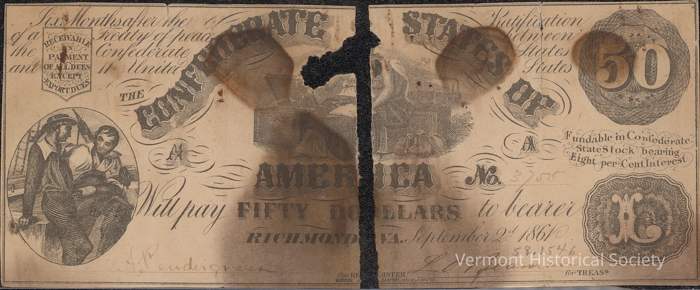 Confederate paper note for 50 dollars. The serial number is 3755. It is signed by A. Vendergrass (register) and L. O. Beaman (treasurer). It is split into 2 pieces down the center.