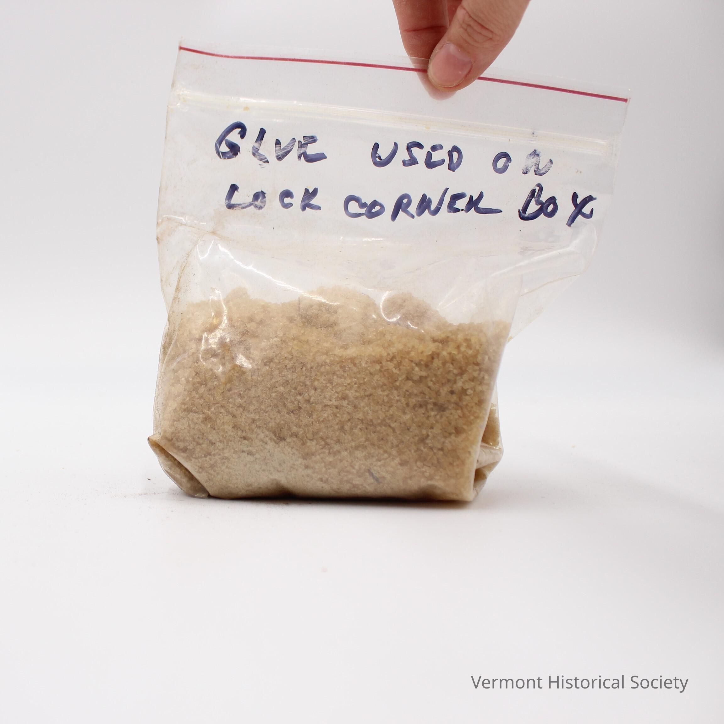 Dry, crystallized glue in a resealable plastic bag. The bag is labeled in permanent marker with, "GLUE USED ON LOCK CORNER BOX".Context