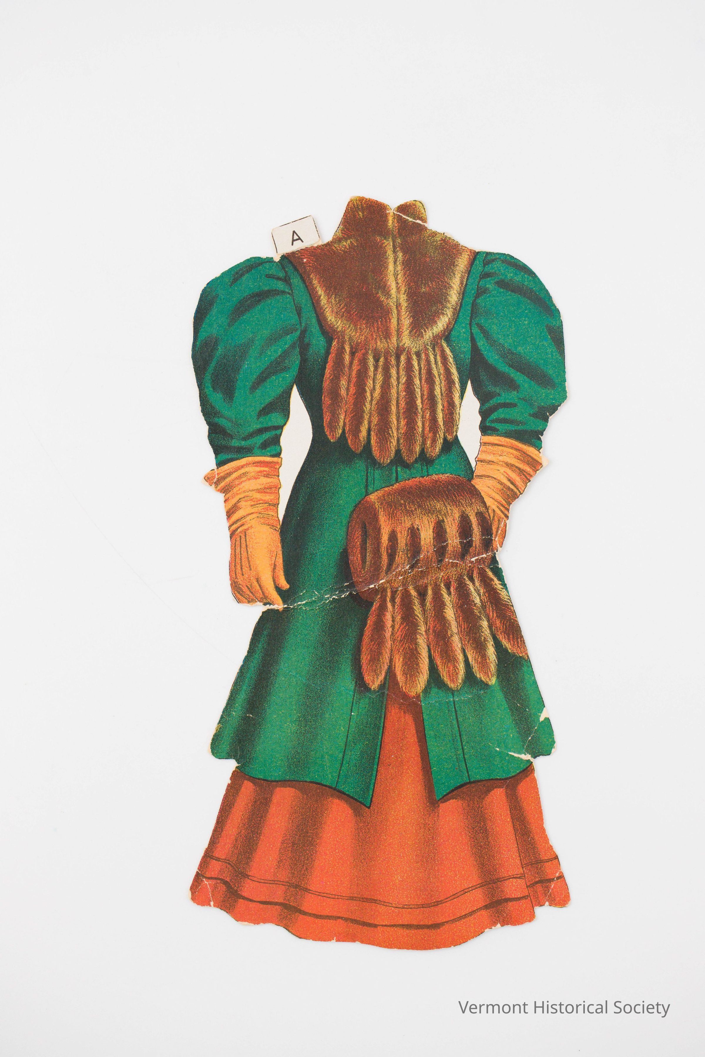 Winter outfit for a paper doll. The outfit consists of a green coat, red skirt, yellow gloves, and brown fur collar and muff.Context