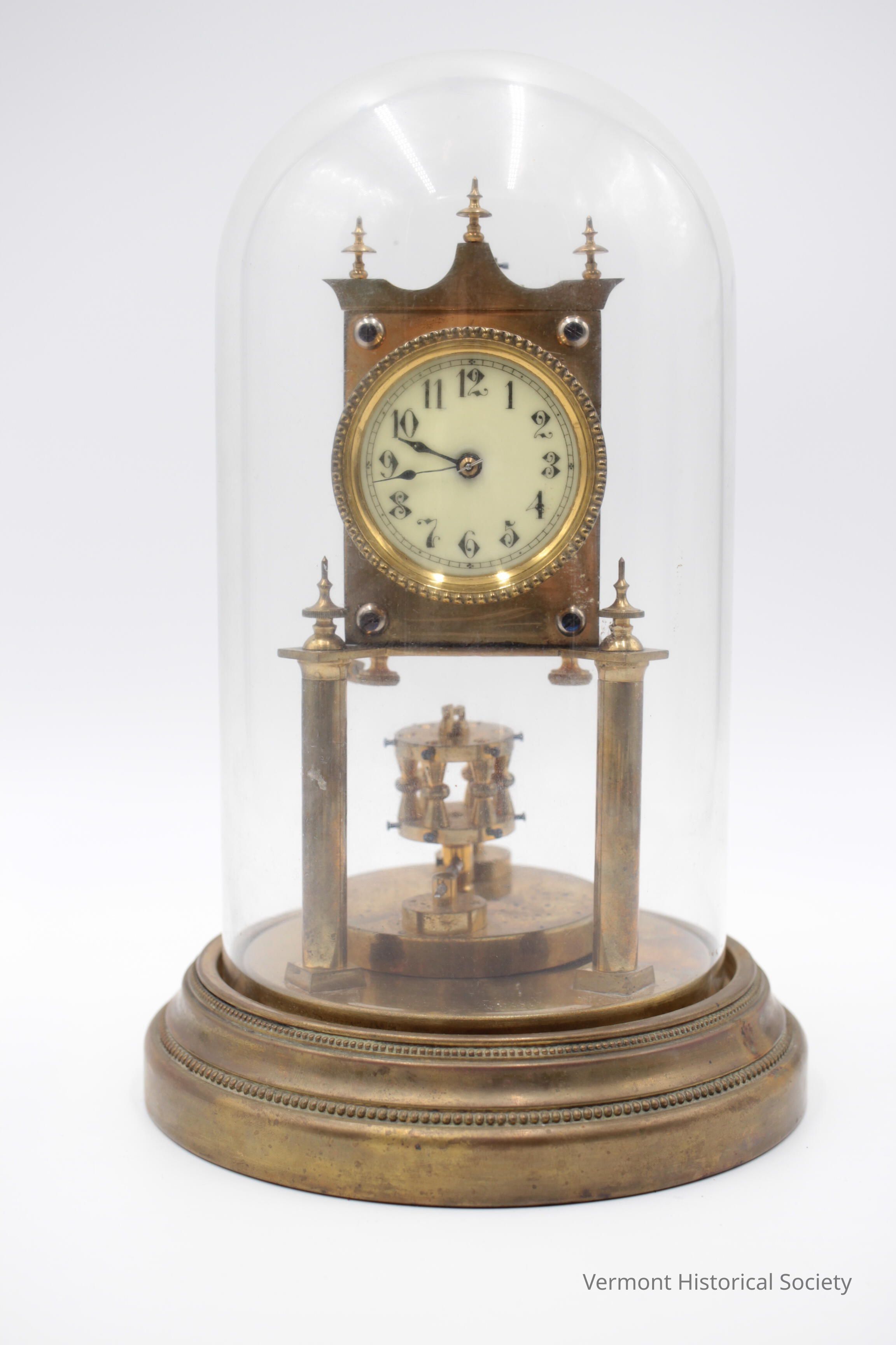 Brass anniversary clock with glass dome. The clock sits on a round, brass base, with the face pedestaled on two columns. The turning pendulum mechanism is disconnected and sits loose behind the columns. The whole is contained within a clear, glass dome.Context
