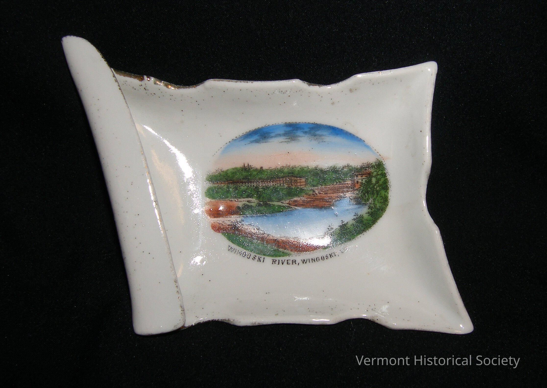 Rectangular white ceramic ashtray with the left edge curled up and inward. The center is printed with a full-color illustration of a river with factories on its bank. The image is labeled, "WINOOSKI RIVER, WINOOSKI, VT." The bottom is marked, "Made in Germany".Acquisition