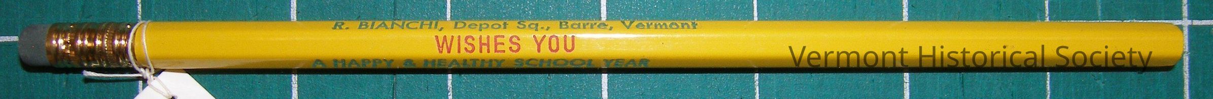 Unused yellow pencil with a green eraser. The pencil is printed with the inscription, "R. BIANCHI, Depot Sq., Barre, Vermont WISHES YOU A HAPPY & HEALTHY SCHOOL YEAR".Context