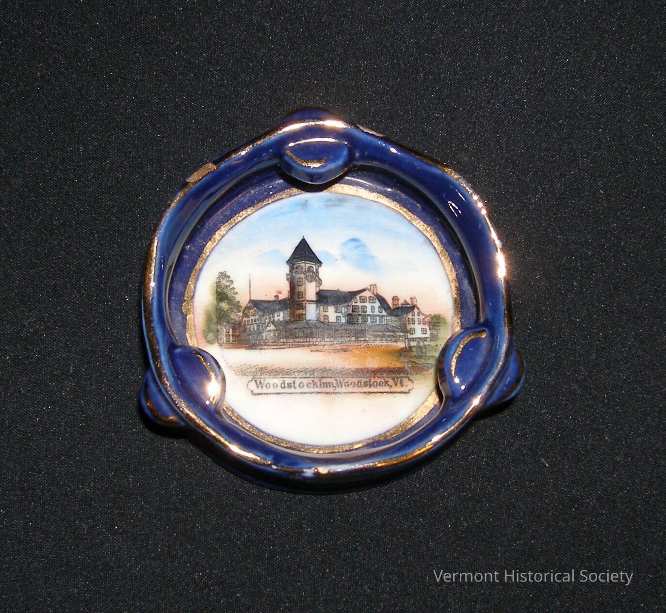 Small dark blue round dish with three small circular "handles" passing through the sides of the dish. There is a gold band around the rim, around each "handle", and around the color image in the center of the dish. The color image is of the "Woodstock Inn, Woodstock, Vt." The bottom is unglazed and has a circle with the words "Made in Germany".Acquisition